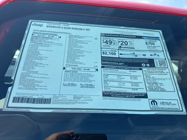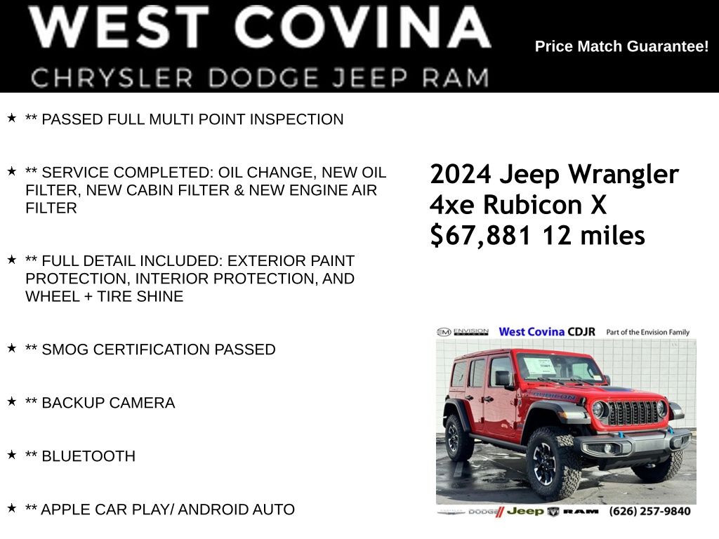** PASSED FULL MULTI POINT INSPECTION, ** SERVICE COMPLETED: OIL CHANGE, NEW OIL FILTER, NEW CABIN FILTER & NEW ENGINE AIR FILTER, ** FULL DETAIL INCLUDED: EXTERIOR PAINT PROTECTION, INTERIOR PROTECTION, AND WHEEL + TIRE SHINE, ** SMOG CERTIFICATION PASSED, ** BACKUP CAMERA, ** BLUETOOTH, ** APPLE CAR PLAY/ ANDROID AUTO, 2.0L I4 DOHC.Firecracker Red Clearcoat2024 Jeep Wrangler Rubicon X 4xe 4WD 8-Speed Automatic 2.0L I4 DOHC Price includes: $3750 - Federal EV Tax Credit. Exp. 12/31/2024 $7500 - 2024 National Retail Consumer Cash . Exp. 10/31/2024