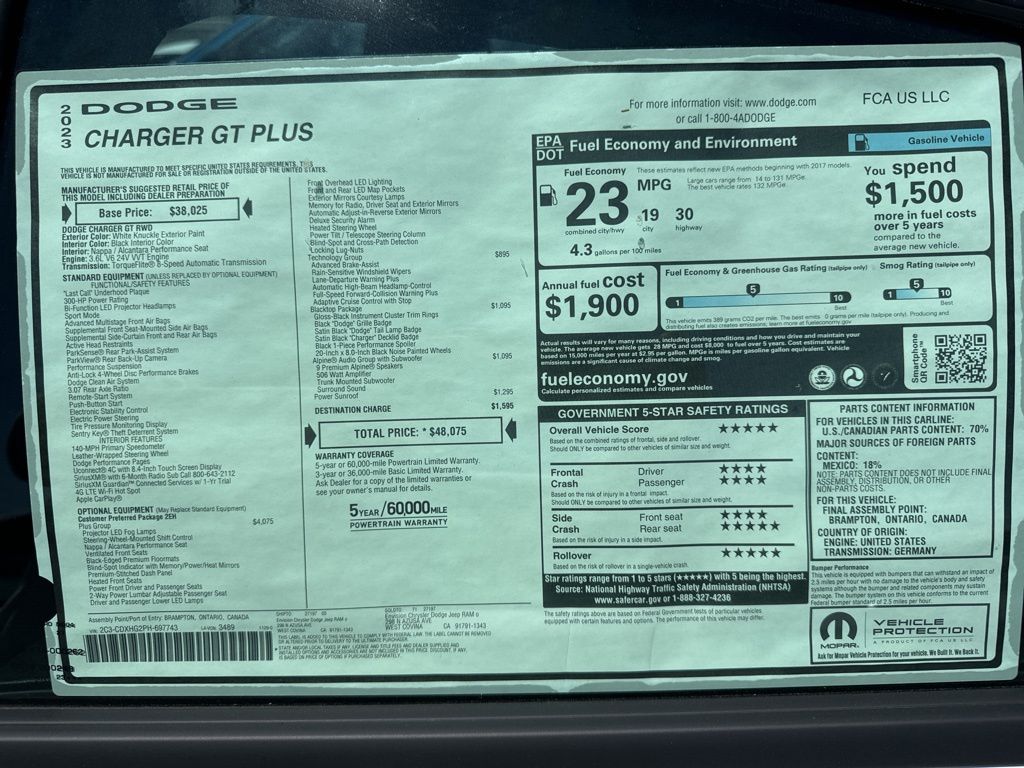 **NEW 2023 UNSOLD INVENTORY PRICED AT PRE-OWNED PRICES AND MANUFACTURER REBATES STILL APPLY****TAKE ADVANTAGE OF OUR LOW PRICES AND DRIVE A NEW VEHICLE MODEL 2023 TODAY**19/30 City/Highway MPG ** CARFAX BUYBACK GUARANTEE **, ** PASSED FULL MULTI POINT INSPECTION, ** SERVICE COMPLETED: OIL CHANGE, NEW OIL FILTER, NEW CABIN FILTER & NEW ENGINE AIR FILTER, ** FULL DETAIL INCLUDED: EXTERIOR PAINT PROTECTION, INTERIOR PROTECTION, AND WHEEL + TIRE SHINE, ** SMOG CERTIFICATION PASSED, ** BACKUP CAMERA, ** BLUETOOTH, ** APPLE CAR PLAY/ ANDROID AUTO, Black Artificial Leather, 506 Watt Amplifier, 9 Premium Alpine Speakers, Adaptive Cruise Control w/Stop, Advanced Brake Assist, Alpine Audio Group w/Subwoofer, Auto Adjust In Reverse Exterior Mirrors, Auto High Beam Headlamp Control, Auto-Dimming Exterior Driver Mirror, Black 1-Piece Performance Spoiler, Black Badge, Black Dodge Grille Badge, Black-Edged Premium Floormats, Blacktop Package, Blind Spot & Cross Path Detection, Blind Spot Memory/Power/Heat Mirror, Deluxe Security Alarm, Driver & Passenger Lower LED Lamps, Exterior Mirrors Courtesy Lamps, Exterior Mirrors w/Heating Element, Front & Rear LED Map Pockets, Front Overhead LED Lighting, Full Speed FWD Collision Warn Plus, Gloss Black I/P Cluster Trim Rings, Heated Front Seats, Heated Steering Wheel, Lane Departure Warning Plus, Nappa/Alcantara Performance Seat, Performance Steering Wheel, Plus Group, Power 2-Way Driver Lumbar Adjust, Power 2-Way Passenger Lumbar Adjust, Power Front Driver/Passenger Seats, Power Tilt/Telescope Steering Column, Premium-Stitched Dash Panel, Projector LED Fog Lamps, Quick Order Package 2EH, Radio/Driver Seat/Mirrors Memory, Rain Sensitive Windshield Wipers, Rear Armrest w/Cupholder Seat, Rhombi 2-Pc Wheel Center Cap, Satin Black Charger Decklid Badge, Satin Black Dodge Tail Lamp Badge, Steering Wheel Mounted Shift Control, Surround Sound, Technology Group, Trunk Mounted Subwoofer, Ventilated Front Seats, Wheels: 20" x 8" Black Noise Painted, Wheels: 20" x 8" Machined w/Granite Pocket.White Knuckle Clearcoat2023 Dodge Charger GT RWD 8-Speed Automatic 3.6L V6 24V VVT Price includes: $3000 - 2023 National Power Dollars Retail Bonus Cash . Exp. 12/02/2024
