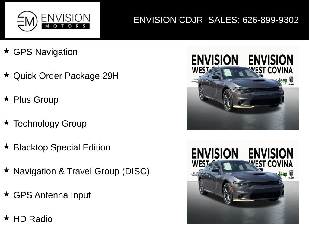 WE SPECIALIZE IN ALL CREDIT PROFILES! See what we can do for you! Call to find out (626) 899-9302.Recent Arrival! Certified. CARFAX One-Owner.Odometer is 14914 miles below market average! 18/27 City/Highway MPG AWD, Black Artificial Leather, 1-Yr SiriusXM Guardian Trial, 2-Piece Shark Fin Antenna, 4G LTE Wi-Fi Hot Spot, 5-Year SiriusXM Traffic Service, 5-Year SiriusXM Travel Link Service, 8.4" Touchscreen Display, Adaptive Cruise Control w/Stop, Advanced Brake Assist, Apple CarPlay, Auto Adjust In Reverse Exterior Mirrors, Auto High Beam Headlamp Control, Auto-Dimming Exterior Driver Mirror, AWD Rhombi Black Badge, Black 1-Piece Performance Spoiler, Black Badge, Black Charger Exhaust Tips, Black Dodge Grille Badge, Black-Edged Premium Floormats, Blacktop Special Edition, Blacktop Special Edition IP Badge, Blind Spot & Cross Path Detection, Blind Spot Memory/Power/Heat Mirror, Compass Gauge, Deluxe Security Alarm, Driver & Passenger Lower LED Lamps, Exterior Mirrors Courtesy Lamps, Exterior Mirrors w/Heating Element, For Details, Visit DriveUconnect.com, Front & Rear LED Map Pockets, Front Overhead LED Lighting, Front Splash Guards, Full Speed FWD Collision Warn Plus, Gloss Black I/P Cluster Trim Rings, Google Android Auto, GPS Antenna Input, GPS Navigation, HD Radio, Heated Front Seats, Heated Steering Wheel, Integrated Center Stack Radio, Integrated Voice Command w/Bluetooth, Lane Departure Warning Plus, Media Hub (2 USB, AUX), Nappa/Alcantara Performance Seat, Navigation & Travel Group (DISC), Performance Steering Wheel, Plus Group, Power 2-Way Driver Lumbar Adjust, Power 2-Way Passenger Lumbar Adjust, Power Front Driver/Passenger Seats, Power Tilt/Telescope Steering Column, Premium-Stitched Dash Panel, Projector LED Fog Lamps, Quick Order Package 29H, Radio: Uconnect 4C Nav w/8.4" Display (DISC), Radio/Driver Seat/Mirrors Memory, Rain Sensitive Windshield Wipers, Real Carbon Fiber Interior Accents, Rear Armrest w/Cupholder Seat, Rhombi 2-Pc Wheel Center Cap, Satin Black Charger Decklid Badge, Satin Black Dodge Tail Lamp Badge, SiriusXM Traffic Plus, SiriusXM Travel Link, Steering Wheel Mounted Shift Control, Technology Group, USB Host Flip, Ventilated Front Seats, Wheels: 20" x 8" Black Noise AWD.Granite Crystal Metallic Clearcoat2023 Dodge Charger GT AWD 8-Speed Automatic 3.6L V6 24V VVTFCA US LLC Certified Pre-Owned Details: * Powertrain Limited Warranty: 84 Month/100,000 Mile (whichever comes first) from original in-service date * Warranty Deductible: $100 * Limited Warranty: 3 Month/3,000 Mile (whichever comes first) after new car warranty expires or from certified purchase date * Vehicles Up to 75,000 Miles and/or 5 Model Years. 24-Hour Towing & Roadside Assistance, Car Rental Allowance, CARFAX® Vehicle History ReportTM and an Introductory 3-month Subscription to SiriusXM® Satellite Radio & Certified Warranty Upgrades * 125 Point Inspection * Vehicle History * Transferable Warranty * Roadside Assistance**********All Pricing and Advertised Prices for any/all vehicles offered for sale does not include dealer installed accessories which can be purchased for an additional cost.********** The Factory Rebates may not be available on this vehicle if you elect to take advantage of a Special Alternative APR or Special Lease program. Some Factory Rebates are California Resident specific and may vary for residents of other states. NO sales to Dealers, Brokers or Exporters. For out of state purchase, customers must be present to purchase. If shipping is required, dealership must facilitate; no exceptions. Please contact us for special Multi-Vehicle or Fleet pricing. Prices are plus government fees and taxes, any finance charges, $85 documentary fee, $29 electronic registration fee, any emission testing charge and $1.75 per new tire state tire fee. *** We make every effort to provide accurate information, but please verify before purchasing. Leasing & financing available on approved credit. Trade-ins