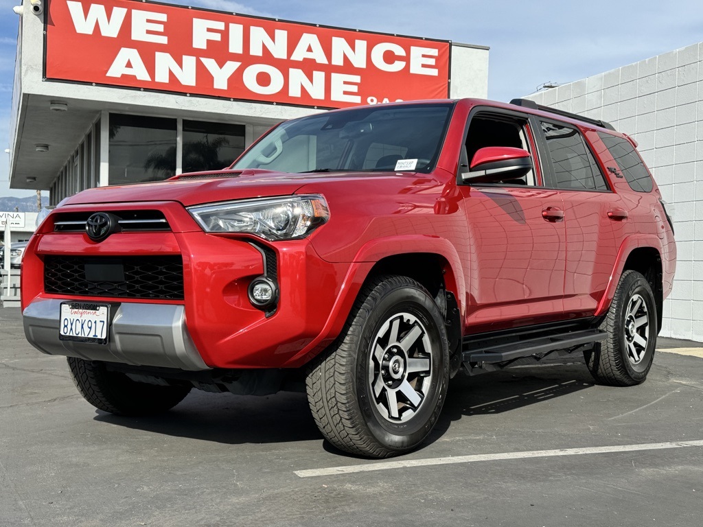CARFAX One-Owner. Clean CARFAX.Odometer is 13555 miles below market average! 4WD, Black/Graphite w/Fabric Seat Trim, Black Roof Rails, Off Road Package.Barcelona Red Metallic2021 Toyota 4Runner TRD Off-Road 4WD 5-Speed Automatic with Overdrive 4.0L V6 SMPI DOHC**********All Pricing and Advertised Prices for any/all vehicles offered for sale does not include dealer installed accessories which can be purchased for an additional cost.********** The Factory Rebates may not be available on this vehicle if you elect to take advantage of a Special Alternative APR or Special Lease program. Some Factory Rebates are California Resident specific and may vary for residents of other states. NO sales to Dealers, Brokers or Exporters. For out of state purchase, customers must be present to purchase. If shipping is required, dealership must facilitate; no exceptions. Please contact us for special Multi-Vehicle or Fleet pricing. Prices are plus government fees and taxes, any finance charges, $85 documentary fee, $29 electronic registration fee, any emission testing charge and $1.75 per new tire state tire fee. *** We make every effort to provide accurate information, but please verify before purchasing. Leasing & financing available on approved credit. Trade-ins accepted. Subject to prior sale.