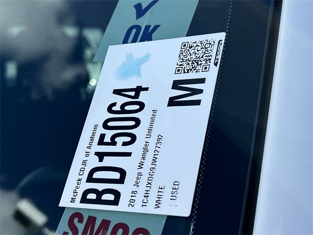 Odometer is 4416 miles below market average! INTERIOR & EXTERIOR PROFESSIONALLY DETAILED FOR DELIVERY, MCPEEK CHRYSLER DODGE JEEP RAM FAMILY OWNED AND OPERATED SINCE 1961 !!!!!.Bright White Clearcoat 2018 Jeep Wrangler Unlimited Sport S 4WD 8-Speed AutomaticAwards: * 2018 KBB.com 10 Most Awarded BrandsReceive Free lube and oil filter changes for up to 45,000 miles for 3 years!!! McPeek's Dodge of Anahiem 1221 S. Auto Center Drive Anahiem, CA 92806 714-262-4902.