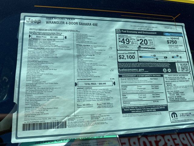 2.0L I4 DOHC.High Velocity Clearcoat2024 Jeep Wrangler Sahara 4xe 4WD 8-Speed Automatic 2.0L I4 DOHC Price includes: $500 - 2024 National 2024 First Responder Bonus Cash. Exp. 06/30/2025 $500 - 2024 National Jeep Celebration Event Bonus Cash. Exp. 03/31/2025 $7500 - 2024 National Retail Consumer Cash . Exp. 03/31/2025