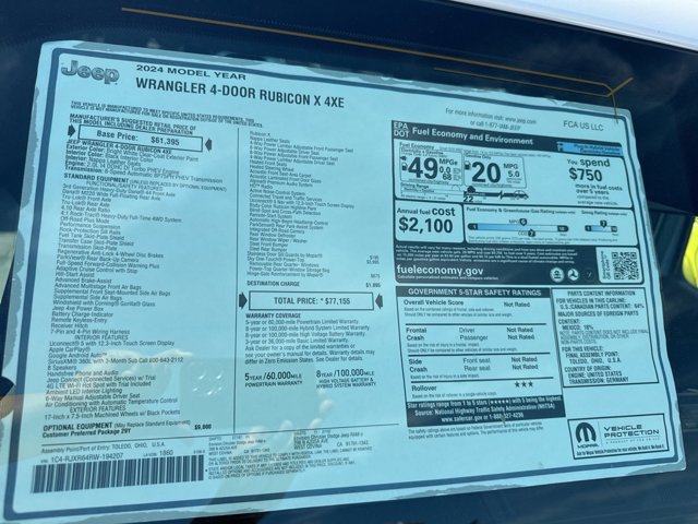 2.0L I4 DOHC.Bright White Clearcoat2024 Jeep Wrangler Rubicon X 4xe 4WD 8-Speed Automatic 2.0L I4 DOHC Price includes: $3000 - 2024 National Retail Consumer Cash . Exp. 07/31/2024 $3750 - Federal EV Tax Credit. Exp. 12/31/2024