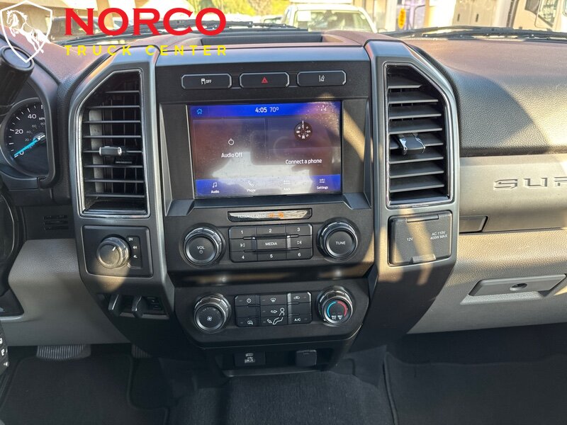 INSTALLED FEATURES: Air filtration, Front air conditioning, Front air conditioning zones: single, Airbag deactivation: passenger switch, Front airbags: dual, Side airbags: front, Side curtain airbags: front / rear, Antenna type: mast, Auxiliary audio input: Bluetooth / USB, Radio: AM/FM / voice operated, Speed sensitive volume control, Total speakers: 4, ABS: 4-wheel, Braking assist, Electronic brakeforce distribution, Front brake diameter: 14.29, Front brake type: ventilated disc, Power brakes, Rear brake diameter: 14.3, Rear brake type: ventilated disc, Armrests: front center, Door sill trim: scuff plate, Floor material: rubber/vinyl, Steering wheel trim: urethane, Assist handle: front / rear, Cupholders: front, Overhead console: front, Power outlet(s): 12V front / USB front / USB-C front, Power steering, Reading lights: front / rear, Rearview mirror: manual day/night, Steering wheel: tilt and telescopic, Steering wheel mounted controls: audio / multi-function / phone / voice control, Storage: accessory hook / door pockets, Vanity mirrors: passenger, 4WD selector: electronic hi-lo, 4WD type: part time, Axle ratio: 3.73, Alternator: 157 amps, Battery: maintenance-free, Battery rating: 650 CCA, Battery saver, Door handle color: black, Front bumper color: black, Grille color: black, License plate bracket: front, Mirror color: black, Pickup bed light, Rear bumper color: black, Tailgate: lift assist / removable, Window trim: black, Connected in-car apps: app marketplace integration, Infotainment: SYNC, Infotainment screen size: 4.2 in., Clock, Digital odometer, External temperature display, Gauge: oil pressure / tachometer / transmission temperature, Instrument cluster screen size: 2.3 in., Powertrain hour meter, Warnings and reminders: low fuel level / maintenance due, Headlights: auto delay off / auto on/off / halogen / quad headlights / wiper activated, Side mirror adjustments: manual / manual folding / manual telescoping, Towing mirrors, Automatic hazard warning lights, Camera system: rearview, Child seat anchors: LATCH system, Crumple zones: front, Impact sensor: alert system / door unlock / post-collision safety system, Programmable safety key, Rearview monitor: in dash, Emergency locking retractors: front / rear, Front seatbelts: 3-point, Rear seatbelts: 3-point, Seatbelt pretensioners: front, Seatbelt warning sensor: front, Driver seat manual adjustments: lumbar / reclining / 6, Front headrests: adjustable / 2, Front seat type: 40-20-40 split bench, Passenger seat manual adjustments: reclining / 4, Rear headrests: adjustable / 3, Rear seat folding: folds up / split, Rear seat type: 60-40 split bench, Upholstery: vinyl, Anti-theft system: vehicle immobilizer, Hill holder control, Roll stability control, Stability control, Traction control, Trailer stability control, Front shock type: gas, Front spring type: coil, Front stabilizer bar, Front suspension classification: solid live axle, Front suspension type: multi-link, Rear shock type: gas, Rear spring type: leaf, Rear suspension classification: solid live axle, Rear suspension type: multi-leaf, Electronic messaging assistance: voice operated / with read function, Phone: voice operated, Smart device app compatibility: FordPass Connect, Smart device app function: engine start / lock operation / maintenance status / vehicle location, Wi-Fi: hotspot, Wireless data link: Bluetooth, Spare tire mount location: underbody, Spare tire size: full-size, Spare wheel type: steel, Tire Pressure Monitoring System, Tire type: all season, Wheels: painted steel, Tow hooks: front, Trailer hitch, Trailer wiring: 4-pin / 7-pin, Front wipers: variable intermittent, Solar-tinted glass: front
