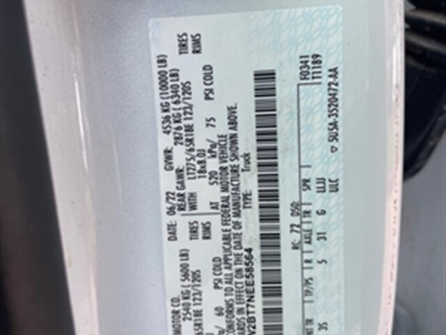 INSTALLED FEATURES: Air filtration, Front air conditioning, Front air conditioning zones: single, Airbag deactivation: passenger switch, Front airbags: dual, Side airbags: front, Side curtain airbags: front / rear, Antenna type: diversity / mast, Auxiliary audio input: Bluetooth / USB / iPod/iPhone, Radio: AM/FM / touch screen display / voice operated, Radio data system, Satellite radio: SiriusXM, Speed sensitive volume control, Total speakers: 7, ABS: 4-wheel, Braking assist, Electronic brakeforce distribution, Emergency braking preparation, Front brake diameter: 14.29, Front brake type: ventilated disc, Power brakes, Rear brake diameter: 14.3, Rear brake type: ventilated disc, Armrests: front center, Door sill trim: scuff plate, Floor mat material: carpet, Floor material: carpet, Floor mats: front / rear, Steering wheel trim: urethane, Assist handle: front / rear, Cruise control, Cupholders: front, Multi-function remote: keyless entry / panic alarm, One-touch windows: 2, Overhead console: front, Power outlet(s): 115V front / 115V rear / 12V front / USB front / USB-C front, Power steering, Power windows: lockout button, Reading lights: front / rear, Rearview mirror: manual day/night, Steering wheel: tilt and telescopic, Steering wheel mounted controls: audio / cruise control / multi-function / phone / voice control, Storage: accessory hook / door pockets / front seatback / in seat cushion / under rear seats, Vanity mirrors: dual, 4WD selector: electronic hi-lo, 4WD type: part time, Axle ratio: 3.73, Alternator: 157 amps, Battery: maintenance-free, Battery rating: 750 CCA, Battery saver, Door handle color: black, Front bumper color: chrome, Grille color: chrome, Mirror color: black, Pickup bed light, Rear bumper color: chrome, Tailgate: lift assist / power locking / removable, Window trim: black, Connected in-car apps: Google POIs / Google search / app marketplace integration, Infotainment: SYNC, Infotainment screen size: 8 in., Smartphone integration: Android Auto / Apple CarPlay, Clock, Digital odometer, External temperature display, Fuel economy display: MPG / range, Gauge: oil pressure / tachometer / transmission temperature, Instrument cluster screen size: 4.2 in., Multi-function display, Powertrain hour meter, Trip odometer, Warnings and reminders: low fuel level / maintenance due, Headlights: auto delay off / auto high beam dimmer / auto on/off / halogen / quad headlights / wiper activated, Side mirror adjustments: manual folding / manual telescoping / power, Side mirrors: heated / integrated turn signals, Towing mirrors, Automatic emergency braking: front, Automatic hazard warning lights, Blind spot safety: sensor/alert / trailer coverage, Camera system: rearview, Child safety door locks, Child seat anchors: LATCH system, Cross traffic alert: rear, Crumple zones: front, Impact sensor: alert system / door unlock / post-collision safety system, Lane deviation sensors, Pre-collision warning system: audible warning / visual warning, Programmable safety key, Rearview monitor: in dash, Emergency locking retractors: front / rear, Front seatbelts: 3-point, Rear seatbelts: 3-point, Seatbelt pretensioners: front, Seatbelt warning sensor: front, Driver seat manual adjustments: lumbar / reclining / 6, Front headrests: adjustable / 2, Front seat type: 40-20-40 split bench, Passenger seat manual adjustments: reclining / 4, Rear headrests: adjustable / 3, Rear seat folding: folds up / split, Rear seat type: 60-40 split bench, Upholstery: cloth, Anti-theft system: alarm / anti-tow sensor / interior motion sensor / vehicle immobilizer, Power door locks, Hill holder control, Roll stability control, Stability control, Traction control, Trailer stability control, Front shock type: gas, Front spring type: coil, Front stabilizer bar, Front suspension classification: solid live axle, Front suspension type: multi-link, Rear shock type: gas, Rear spring type: leaf, Rear suspension classification: solid live axle, Rear suspension type: multi-leaf, Electronic messaging assistance: voice operated / with read function, Phone: voice operated, Smart device app compatibility: FordPass Connect, Smart device app function: engine start / lock operation / maintenance status / vehicle location, Wi-Fi: hotspot, Wireless data link: Bluetooth, Spare tire mount location: underbody, Spare tire size: full-size, Spare wheel type: steel, Tire Pressure Monitoring System, Tire type: all season, Wheels: painted aluminum alloy, Pickup bed cargo management: tie-down anchors, Tow hooks: front, Trailer brake controller, Trailer hitch, Trailer wiring: 4-pin / 7-pin, Front wipers: variable intermittent, Power windows: safety reverse, Rear privacy glass, Solar-tinted glass: front