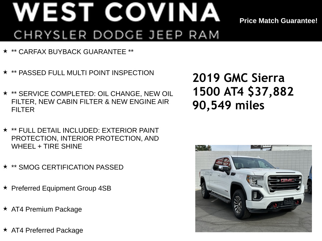 MEMORIAL DAY SALES EVENT HAS STARTED!!! COME CHECK OUT OUR HARD TO BEAT INVENTORY PRICES THAT HAVE BEEN REDUCED TO SAVE YOU MONEY. CALL (626) 899-9302 TO GET MORE INFORMATIONWE SPECIALIZE IN ALL CREDIT PROFILES! See what we can do for you! Call to find out (626) 899-9302.CARFAX One-Owner. Clean CARFAX.10-Speed Automatic, 4WD, Jet Black With Kalahari Accents Leather.Summit White2019 GMC Sierra 1500 AT4 4WD 10-Speed Automatic EcoTec3 6.2L V8**********All Pricing and Advertised Prices for any/all vehicles offered for sale does not include dealer installed accessories which can be purchased for an additional cost.********** The Factory Rebates may not be available on this vehicle if you elect to take advantage of a Special Alternative APR or Special Lease program. Some Factory Rebates are California Resident specific and may vary for residents of other states. NO sales to Dealers, Brokers or Exporters. For out of state purchase, customers must be present to purchase. If shipping is required, dealership must facilitate; no exceptions. Please contact us for special Multi-Vehicle or Fleet pricing. Prices are plus government fees and taxes, any finance charges, $85 documentary fee, $29 electronic registration fee, any emission testing charge and $1.75 per new tire state tire fee. *** We make every effort to provide accurate information, but please verify before purchasing. Leasing & financing available on approved credit. Trade-ins accepted. Subject to prior sale.