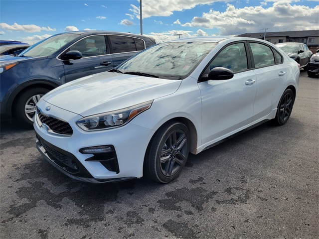 CARFAX One-Owner.Priced below KBB Fair Purchase Price!Odometer is 1360 miles below market average!29/40 City/Highway MPGSnow White Pearl 2021 Kia Forte GT-Line FWD IVT 2.0L 4-Cylinder MPIIf you don't drive here, you can't save here!Awards: * JD Power Initial Quality Study (IQS)Price may not include recon fee. Kia Certified Pre-Owned Certified, 4-Wheel Disc Brakes, 6 Speakers, ABS brakes, Air Conditioning, Alloy wheels, AM/FM radio, Apple CarPlay & Android Auto, Brake assist, Bumpers: body-color, Cloth & Leatherette Seat Trim, Delay-off headlights, Driver door bin, Driver vanity mirror, Dual front impact airbags, Dual front side impact airbags, Electronic Stability Control, Exterior Parking Camera Rear, Front anti-roll bar, Front Bucket Seats, Front Center Armrest, Front fog lights, Front reading lights, Front Sport Seats, Front wheel independent suspension, Fully automatic headlights, Heated door mirrors, Illuminated entry, Lane Departure Warning System, Leather Shift Knob, Leather steering wheel, Low tire pressure warning, Occupant sensing airbag, Outside temperature display, Overhead airbag, Overhead console, Panic alarm, Passenger door bin, Passenger vanity mirror, Power door mirrors, Power steering, Power windows, Radio data system, Radio: AM/FM/MP3 Display Audio System, Rear seat center armrest, Rear window defroster, Remote keyless entry, Security system, Speed control, Split folding rear seat, Spoiler, Steering wheel mounted audio controls, Tachometer, Telescoping steering wheel, Tilt steering wheel, Traction control, Trip computer, Turn signal indicator mirrors, Variably intermittent wipers, and Wheels: 17" Graphite Finish Alloy.
