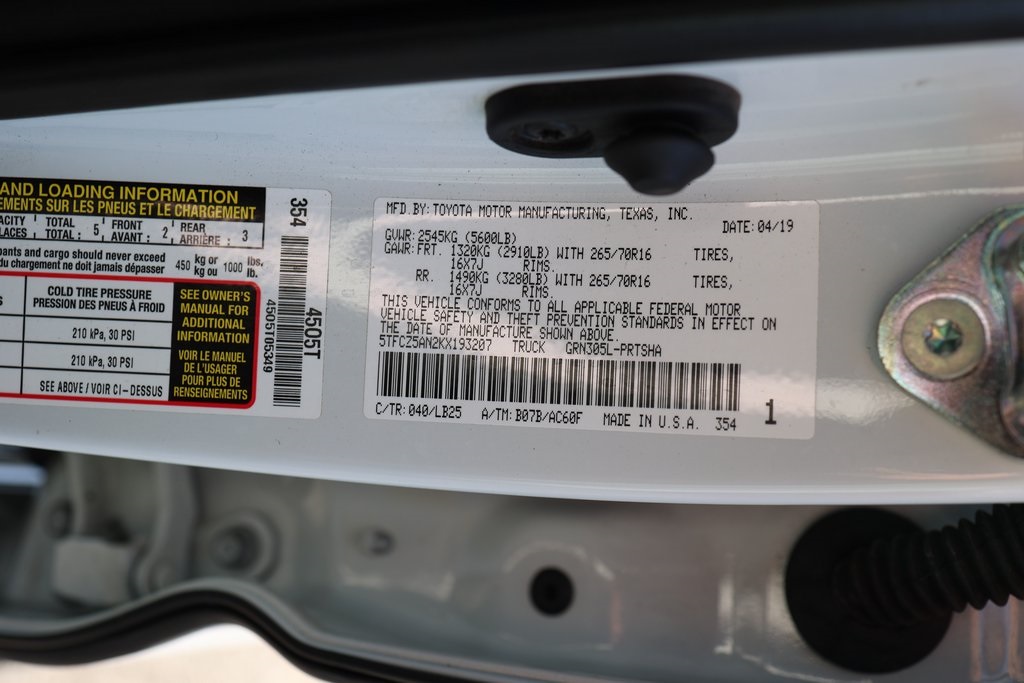 4WD, TRD Pro Package (TR), TRD Pro Shift Knob, TRD-Tuned Off-Road Suspension (TR), Variable Intermittent Wipers. 120V/400W Deck Mounted AC Power, ABS brakes, Active Cruise Control, Alloy wheels, Auto-Dimming Inside Rear-View Mirror w/Compass, Black Overfenders, Blind Spot Monitor w/Rear Cross Traffic Alert, Dual Zone Automatic Climate Control, Electronic Stability Control, Engine Immobilizer, Front dual zone A/C, Heated front seats, Hood Graphics, Illuminated entry, Lane Change Assist, Low tire pressure warning, Navigation System, Power moonroof, Power Sliding Rear Window w/Privacy Glass, Projector-Beam Headlights, Rear Parking Assist Sonar, Remote keyless entry, Rigid Industries LED fog lights, Smart Key w/Push Button Start, Traction control, TRD Floor Mats, TRD Pro Cat-Back Exhaust, TRD Pro Exterior Badging, Clean CARFAX.Awards: * 2019 KBB.com Best Resale Value Awards * 2019 KBB.com Brand Image Awards