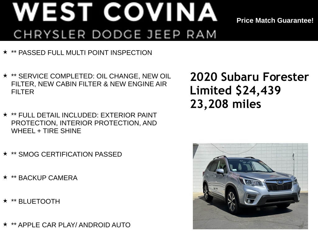 SPRING SALES BLOW OUT EVENT STARTS TODAY!!! COME CHECK OUT OUR HARD TO BEAT INVENTORY PRICES THAT HAVE BEEN SLASHED TO SAVE YOU MONEY. CALL (626) 899-9302 TO GET MORE INFORMATIONWE SPECIALIZE IN ALL CREDIT PROFILES! See what we can do for you! Call to find out (626) 899-9302.CARFAX One-Owner. Clean CARFAX.Odometer is 21973 miles below market average! 26/33 City/Highway MPG ** PASSED FULL MULTI POINT INSPECTION, ** SERVICE COMPLETED: OIL CHANGE, NEW OIL FILTER, NEW CABIN FILTER & NEW ENGINE AIR FILTER, ** FULL DETAIL INCLUDED: EXTERIOR PAINT PROTECTION, INTERIOR PROTECTION, AND WHEEL + TIRE SHINE, ** SMOG CERTIFICATION PASSED, ** BACKUP CAMERA, ** BLUETOOTH, ** APPLE CAR PLAY/ ANDROID AUTO, 6 Speakers, AM/FM radio: SiriusXM, CD player, Radio data system, Radio: Subaru Starlink 8.0" Multimedia Plus System.Ice Silver Metallic2020 Subaru Forester Limited AWD Lineartronic CVT 2.5L 4-Cylinder DOHC 16V VVT**********All Pricing and Advertised Prices for any/all vehicles offered for sale does not include dealer installed accessories which can be purchased for an additional cost.********** The Factory Rebates may not be available on this vehicle if you elect to take advantage of a Special Alternative APR or Special Lease program. Some Factory Rebates are California Resident specific and may vary for residents of other states. NO sales to Dealers, Brokers or Exporters. For out of state purchase, customers must be present to purchase. If shipping is required, dealership must facilitate; no exceptions. Please contact us for special Multi-Vehicle or Fleet pricing. Prices are plus government fees and taxes, any finance charges, $85 documentary fee, $29 electronic registration fee, any emission testing charge and $1.75 per new tire state tire fee. *** We make every effort to provide accurate information, but please verify before purchasing. Leasing & financing available on approved credit. Trade-ins accepted. Subject to prior sale.