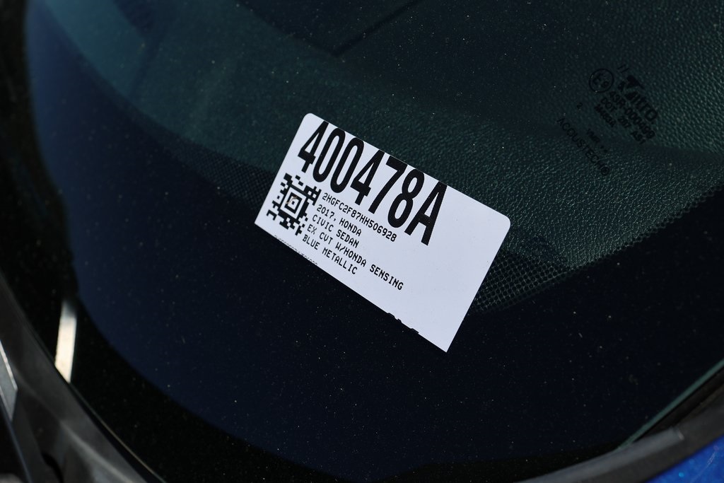 Aegean Blue Metallic 2017 Honda Civic EX w/Honda Sensing FWD CVT 2.0L I4 DOHC 16V i-VTEC Black w/Cloth Seat Trim, 16" Alloy Wheels, Exterior Parking Camera Rear, Fully automatic headlights, Power moonroof, Radio: 180-Watt AM/FM/HD/SiriusXM Audio System.Recent Arrival! 31/40 City/Highway MPGAwards: * 2017 IIHS Top Safety Pick (When equipped with Honda Sensing) * 2017 KBB.com Brand Image Awards * 2017 KBB.com 10 Most Awarded BrandsKelley Blue Book Brand Image Awards are based on the Brand Watch(tm) study from Kelley Blue Book Market Intelligence. Award calculated among non-luxury shoppers. For more information, visit www.kbb.com. Kelley Blue Book is a registered trademark of Kelley Blue Book Co., Inc.