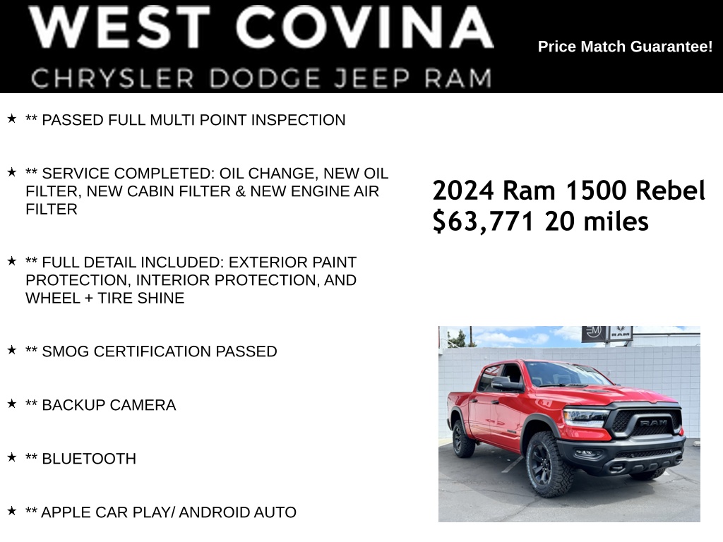 ** PASSED FULL MULTI POINT INSPECTION, ** SERVICE COMPLETED: OIL CHANGE, NEW OIL FILTER, NEW CABIN FILTER & NEW ENGINE AIR FILTER, ** FULL DETAIL INCLUDED: EXTERIOR PAINT PROTECTION, INTERIOR PROTECTION, AND WHEEL + TIRE SHINE, ** SMOG CERTIFICATION PASSED, ** BACKUP CAMERA, ** BLUETOOTH, ** APPLE CAR PLAY/ ANDROID AUTO.Flame Red Clearcoat2024 Ram 1500 Rebel 4WD 8-Speed Automatic HEMI 5.7L V8 Multi Displacement VVT eTorque Price includes: $4500 - 2024 National Retail Consumer Cash . Exp. 09/03/2024
