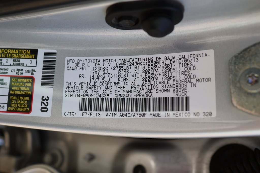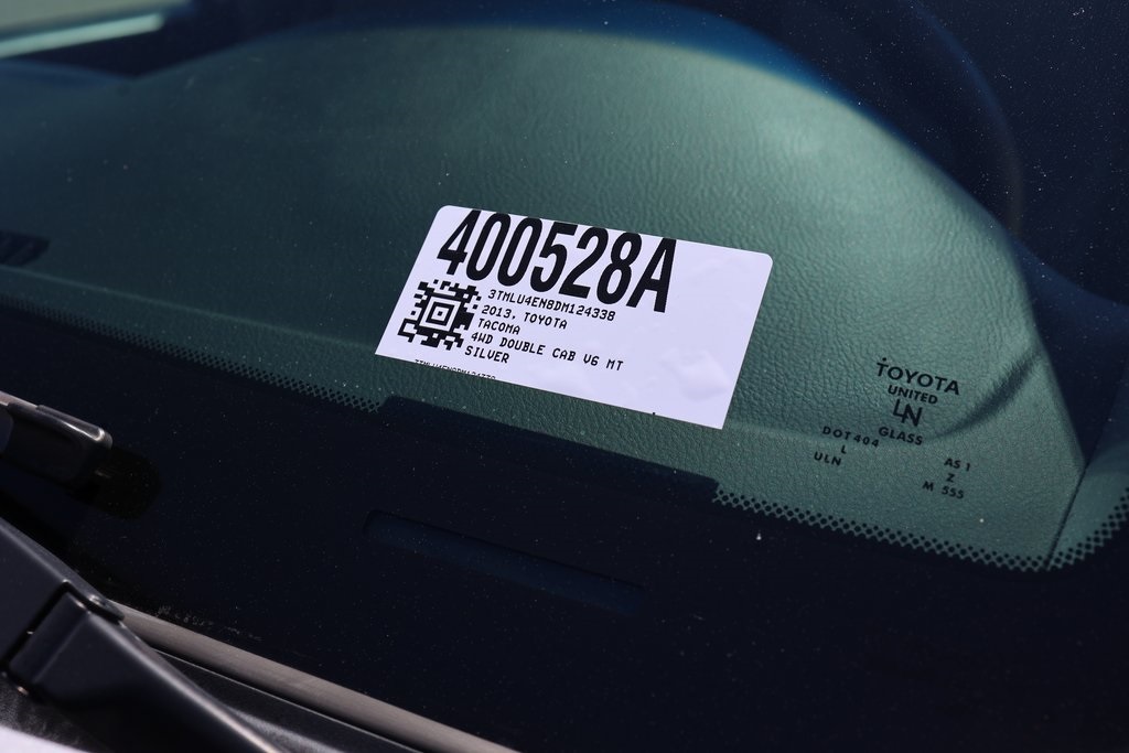 Silver Streak Metallic 2013 Toyota Tacoma V6 4WD 6-Speed Manual with Overdrive 4.0L V6 EFI DOHC 24V 4WD, 16" x 7J+30 Style Steel Wheels, Air Conditioning, Compass & Outside Temperature Gauge, Fabric Seat Trim (FJ), Front Fog & Driving Lamps, Privacy Glass, Sliding Rear Window, Sport Seats, Tailgate-Handle Integrated Backup Camera, TRD Off-Road Package.Recent Arrival!Awards: * 2013 KBB.com Best Resale Value Awards * 2013 KBB.com Brand Image AwardsReviews: * Powerful and fuel-efficient engines; wide variety of body styles and trims; impressive build quality; full-size truck utility in a smaller package. Source: Edmunds * If you’re looking for a proven pickup that is as capable as it is stylish, the 2013 Toyota Tacoma deserves your attention. Nearly as capable as a full-size pickup but without the extra bulk and fuel consumption, the Tacoma fits a lot of needs. Source: KBB.com
