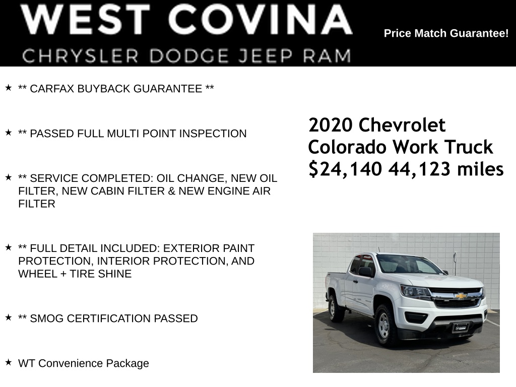 MEMORIAL DAY SALES EVENT HAS STARTED!!! COME CHECK OUT OUR HARD TO BEAT INVENTORY PRICES THAT HAVE BEEN REDUCED TO SAVE YOU MONEY. CALL (626) 899-9302 TO GET MORE INFORMATION** REMOTE KEYLESS ENTRY **** CRUISE CONTROL **** EZ LIFT AND LOWER TAILGATE **** 4-WAY POWER DRIVER SEAT **WE SPECIALIZE IN ALL CREDIT PROFILES! See what we can do for you! Call to find out (626) 899-9302.Recent Arrival! CARFAX One-Owner. Clean CARFAX.4WD.Summit White2020 Chevrolet Colorado Work Truck 4WD 6-Speed Automatic 2.5L I4 DI DOHC VVT**********All Pricing and Advertised Prices for any/all vehicles offered for sale does not include dealer installed accessories which can be purchased for an additional cost.********** The Factory Rebates may not be available on this vehicle if you elect to take advantage of a Special Alternative APR or Special Lease program. Some Factory Rebates are California Resident specific and may vary for residents of other states. NO sales to Dealers, Brokers or Exporters. For out of state purchase, customers must be present to purchase. If shipping is required, dealership must facilitate; no exceptions. Please contact us for special Multi-Vehicle or Fleet pricing. Prices are plus government fees and taxes, any finance charges, $85 documentary fee, $29 electronic registration fee, any emission testing charge and $1.75 per new tire state tire fee. *** We make every effort to provide accurate information, but please verify before purchasing. Leasing & financing available on approved credit. Trade-ins accepted. Subject to prior sale.Awards: * 2020 KBB.com Best Buy Awards