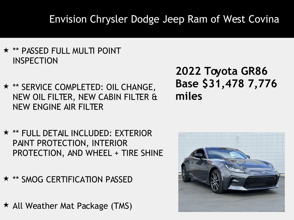 SPRING SALES BLOW OUT EVENT STARTS TODAY!!! COME CHECK OUT OUR HARD TO BEAT INVENTORY PRICES THAT HAVE BEEN SLASHED TO SAVE YOU MONEY. CALL (626) 899-9302 TO GET MORE INFORMATION** LED BRAKELIGHTS **** BACK-UP CAMERA **** GALVANIZED STEEL/ ALUMINUM PANELS **** SPORT TUNED SUSPENSION **WE SPECIALIZE IN ALL CREDIT PROFILES! See what we can do for you! Call to find out (626) 899-9302.Recent Arrival! CARFAX One-Owner.20/27 City/Highway MPGGray2022 Toyota GR86 RWD Close-Ratio 6-Speed Manual 2.4L I4 DOHC**********All Pricing and Advertised Prices for any/all vehicles offered for sale does not include dealer installed accessories which can be purchased for an additional cost.********** The Factory Rebates may not be available on this vehicle if you elect to take advantage of a Special Alternative APR or Special Lease program. Some Factory Rebates are California Resident specific and may vary for residents of other states. NO sales to Dealers, Brokers or Exporters. For out of state purchase, customers must be present to purchase. If shipping is required, dealership must facilitate; no exceptions. Please contact us for special Multi-Vehicle or Fleet pricing. Prices are plus government fees and taxes, any finance charges, $85 documentary fee, $29 electronic registration fee, any emission testing charge and $1.75 per new tire state tire fee. *** We make every effort to provide accurate information, but please verify before purchasing. Leasing & financing available on approved credit. Trade-ins accepted. Subject to prior sale.