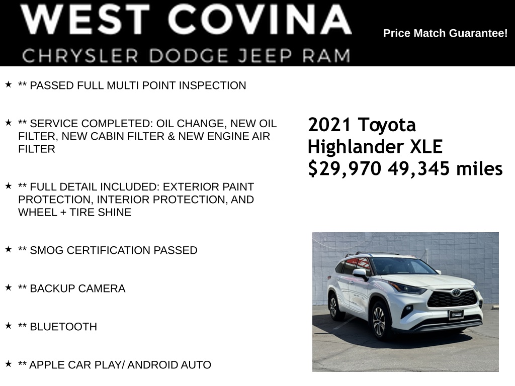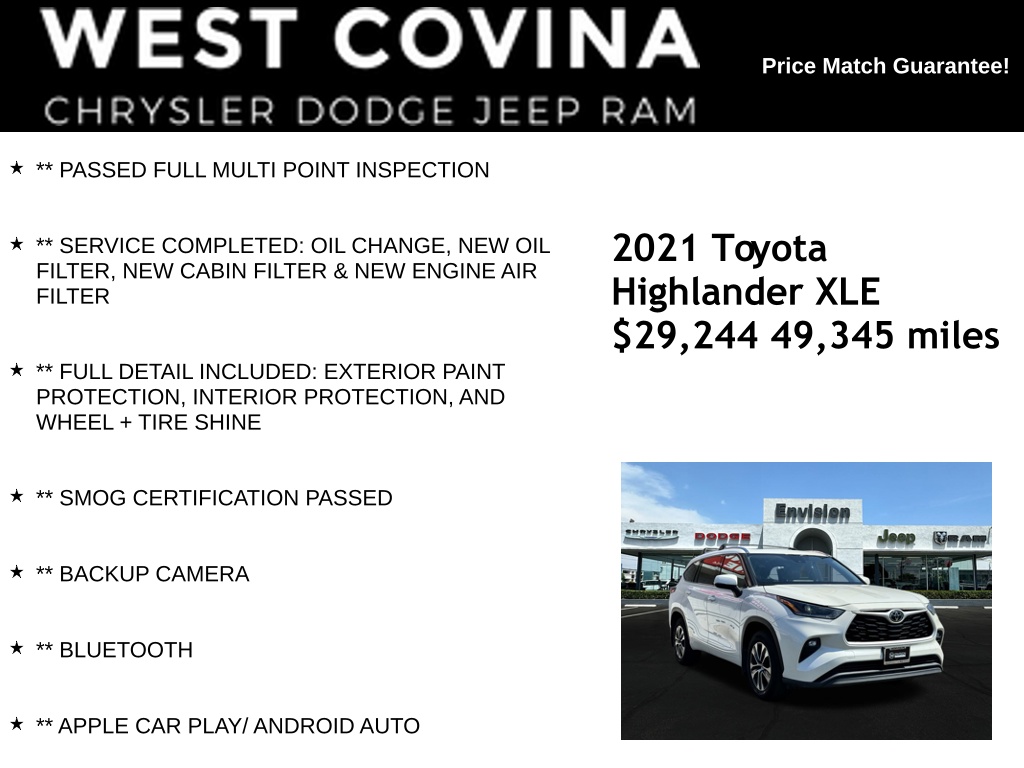 INDEPENDENCE DAY CELEBRATION HAS BEGUN. COME CHECK OUT OUR HARD TO BEAT INVENTORY PRICES. CALL (626) 899-9302 TO GET MORE INFORMATION** LANE TRACING ASSIST **** BACK-UP CAMERA **** PREMIUM AUDIO **** DYNAMIC NAVIGATION **WE SPECIALIZE IN ALL CREDIT PROFILES! See what we can do for you! Call to find out (626) 899-9302.Recent Arrival! CARFAX One-Owner.21/29 City/Highway MPG ** PASSED FULL MULTI POINT INSPECTION, ** SERVICE COMPLETED: OIL CHANGE, NEW OIL FILTER, NEW CABIN FILTER & NEW ENGINE AIR FILTER, ** FULL DETAIL INCLUDED: EXTERIOR PAINT PROTECTION, INTERIOR PROTECTION, AND WHEEL + TIRE SHINE, ** SMOG CERTIFICATION PASSED, ** BACKUP CAMERA, ** BLUETOOTH, ** APPLE CAR PLAY/ ANDROID AUTO.White2021 Toyota Highlander XLE FWD 8-Speed Automatic 3.5L V6 DOHC**********All Pricing and Advertised Prices for any/all vehicles offered for sale does not include dealer installed accessories which can be purchased for an additional cost.********** The Factory Rebates may not be available on this vehicle if you elect to take advantage of a Special Alternative APR or Special Lease program. Some Factory Rebates are California Resident specific and may vary for residents of other states. NO sales to Dealers, Brokers or Exporters. For out of state purchase, customers must be present to purchase. If shipping is required, dealership must facilitate; no exceptions. Please contact us for special Multi-Vehicle or Fleet pricing. Prices are plus government fees and taxes, any finance charges, $85 documentary fee, $29 electronic registration fee, any emission testing charge and $1.75 per new tire state tire fee. *** We make every effort to provide accurate information, but please verify before purchasing. Leasing & financing available on approved credit. Trade-ins accepted. Subject to prior sale.Awards: * ALG Residual Value Awards, Residual Value Awards