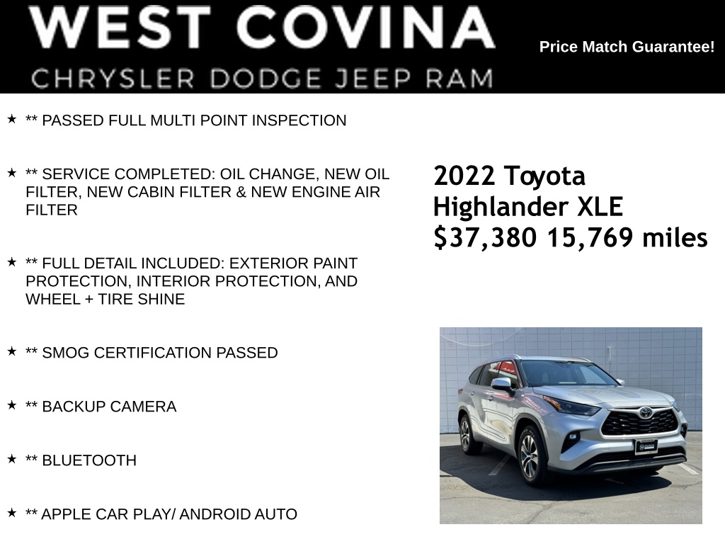 INDEPENDENCE DAY CELEBRATION HAS BEGUN. COME CHECK OUT OUR HARD TO BEAT INVENTORY PRICES. CALL (626) 899-9302 TO GET MORE INFORMATION** PREMIUM AUDIO W/ NAVIGATION **** BLIND SPOT MONITORS **** LANE TRACING ASSIST **WE SPECIALIZE IN ALL CREDIT PROFILES! See what we can do for you! Call to find out (626) 899-9302.Recent Arrival! CARFAX One-Owner.21/29 City/Highway MPG ** PASSED FULL MULTI POINT INSPECTION, ** SERVICE COMPLETED: OIL CHANGE, NEW OIL FILTER, NEW CABIN FILTER & NEW ENGINE AIR FILTER, ** FULL DETAIL INCLUDED: EXTERIOR PAINT PROTECTION, INTERIOR PROTECTION, AND WHEEL + TIRE SHINE, ** SMOG CERTIFICATION PASSED, ** BACKUP CAMERA, ** BLUETOOTH, ** APPLE CAR PLAY/ ANDROID AUTO.Silver2022 Toyota Highlander XLE FWD 8-Speed Automatic 3.5L V6 DOHC**********All Pricing and Advertised Prices for any/all vehicles offered for sale does not include dealer installed accessories which can be purchased for an additional cost.********** The Factory Rebates may not be available on this vehicle if you elect to take advantage of a Special Alternative APR or Special Lease program. Some Factory Rebates are California Resident specific and may vary for residents of other states. NO sales to Dealers, Brokers or Exporters. For out of state purchase, customers must be present to purchase. If shipping is required, dealership must facilitate; no exceptions. Please contact us for special Multi-Vehicle or Fleet pricing. Prices are plus government fees and taxes, any finance charges, $85 documentary fee, $29 electronic registration fee, any emission testing charge and $1.75 per new tire state tire fee. *** We make every effort to provide accurate information, but please verify before purchasing. Leasing & financing available on approved credit. Trade-ins accepted. Subject to prior sale.