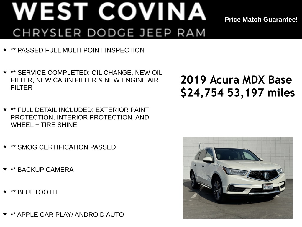 SPRING SALES BLOW OUT EVENT STARTS TODAY!!! COME CHECK OUT OUR HARD TO BEAT INVENTORY PRICES THAT HAVE BEEN SLASHED TO SAVE YOU MONEY. CALL (626) 899-9302 TO GET MORE INFORMATION** BACK-UP CAMERA **** DAYNIGHT REARVIEW CAMERA **** CHROME DOOR HANDLES **WE SPECIALIZE IN ALL CREDIT PROFILES! See what we can do for you! Call to find out (626) 899-9302.Recent Arrival!20/27 City/Highway MPG ** PASSED FULL MULTI POINT INSPECTION, ** SERVICE COMPLETED: OIL CHANGE, NEW OIL FILTER, NEW CABIN FILTER & NEW ENGINE AIR FILTER, ** FULL DETAIL INCLUDED: EXTERIOR PAINT PROTECTION, INTERIOR PROTECTION, AND WHEEL + TIRE SHINE, ** SMOG CERTIFICATION PASSED, ** BACKUP CAMERA, ** BLUETOOTH, ** APPLE CAR PLAY/ ANDROID AUTO.White2019 Acura MDX 3.5L FWD 9-Speed Automatic 3.5L V6 SOHC i-VTEC 24V**********All Pricing and Advertised Prices for any/all vehicles offered for sale does not include dealer installed accessories which can be purchased for an additional cost.********** The Factory Rebates may not be available on this vehicle if you elect to take advantage of a Special Alternative APR or Special Lease program. Some Factory Rebates are California Resident specific and may vary for residents of other states. NO sales to Dealers, Brokers or Exporters. For out of state purchase, customers must be present to purchase. If shipping is required, dealership must facilitate; no exceptions. Please contact us for special Multi-Vehicle or Fleet pricing. Prices are plus government fees and taxes, any finance charges, $85 documentary fee, $29 electronic registration fee, any emission testing charge and $1.75 per new tire state tire fee. *** We make every effort to provide accurate information, but please verify before purchasing. Leasing & financing available on approved credit. Trade-ins accepted. Subject to prior sale.Awards: * 2019 KBB.com Brand Image AwardsFor more information, visit www.kbb.com. Kelley Blue Book is a registered trademark of Kelley Blue Book Co., Inc.