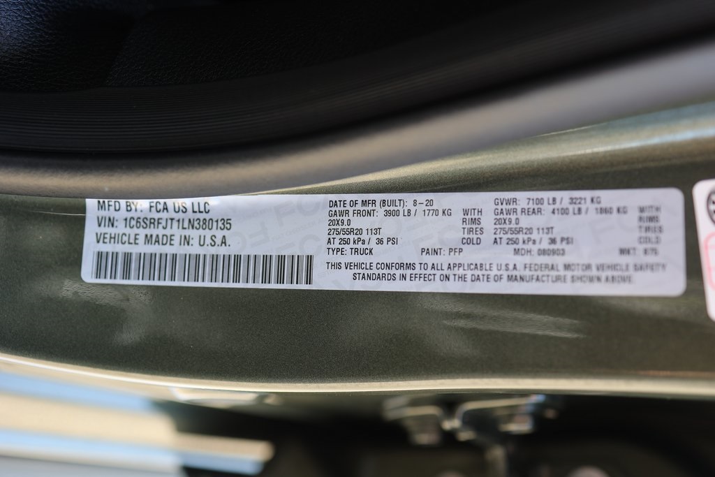 Olive Green Pearlcoat 2020 Ram 1500 Laramie 4WD 8-Speed Automatic HEMI 5.7L V8 Multi Displacement VVT eTorque 3.92 Rear Axle Ratio, 33 Gallon Fuel Tank, 48V Belt Starter Generator, Air Conditioning, Apple CarPlay/Android Auto, Auto High Beam Headlamp Control, Blind Spot & Cross Path Detection, Driver Seat Memory, Foam Bottle Insert (Door Trim Panel), Fully automatic headlights, Google Android Auto, Laramie Level 1 Equipment Group, Memory seat, ParkSense Front/Rear Park Assist w/Stop, ParkView Rear Back-Up Camera, Pedal memory, Quick Order Package 27H Laramie, Rain Sensitive Windshield Wipers, Rear 60/40 Folding Split Recline Seat, Remote Tailgate Release, Tailgate Ajar Warning Lamp, Trailer Brake Control, Ventilated Front Seats, Wheels: 20" x 9" Premium Paint/Polished.Recent Arrival!Awards: * JD Power Automotive Performance, Execution and Layout (APEAL) Study