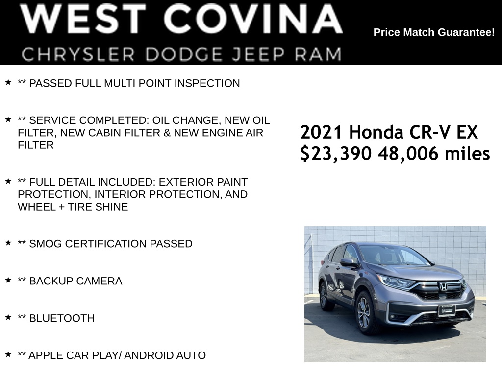 SPRING SALES BLOW OUT EVENT STARTS TODAY!!! COME CHECK OUT OUR HARD TO BEAT INVENTORY PRICES THAT HAVE BEEN SLASHED TO SAVE YOU MONEY. CALL (626) 899-9302 TO GET MORE INFORMATION** FRONT FOG LAMPS **** BLUETOOTH STREAMING AUDIO **** APPLE CARPLAY INTEGRATION **** BACK-UP CAMERA **WE SPECIALIZE IN ALL CREDIT PROFILES! See what we can do for you! Call to find out (626) 899-9302.Recent Arrival! Clean CARFAX.27/32 City/Highway MPG ** PASSED FULL MULTI POINT INSPECTION, ** SERVICE COMPLETED: OIL CHANGE, NEW OIL FILTER, NEW CABIN FILTER & NEW ENGINE AIR FILTER, ** FULL DETAIL INCLUDED: EXTERIOR PAINT PROTECTION, INTERIOR PROTECTION, AND WHEEL + TIRE SHINE, ** SMOG CERTIFICATION PASSED, ** BACKUP CAMERA, ** BLUETOOTH, ** APPLE CAR PLAY/ ANDROID AUTO, AWD.Gray2021 Honda CR-V EX AWD CVT 1.5L I4 DOHC 16V**********All Pricing and Advertised Prices for any/all vehicles offered for sale does not include dealer installed accessories which can be purchased for an additional cost.********** The Factory Rebates may not be available on this vehicle if you elect to take advantage of a Special Alternative APR or Special Lease program. Some Factory Rebates are California Resident specific and may vary for residents of other states. NO sales to Dealers, Brokers or Exporters. For out of state purchase, customers must be present to purchase. If shipping is required, dealership must facilitate; no exceptions. Please contact us for special Multi-Vehicle or Fleet pricing. Prices are plus government fees and taxes, any finance charges, $85 documentary fee, $29 electronic registration fee, any emission testing charge and $1.75 per new tire state tire fee. *** We make every effort to provide accurate information, but please verify before purchasing. Leasing & financing available on approved credit. Trade-ins accepted. Subject to prior sale.