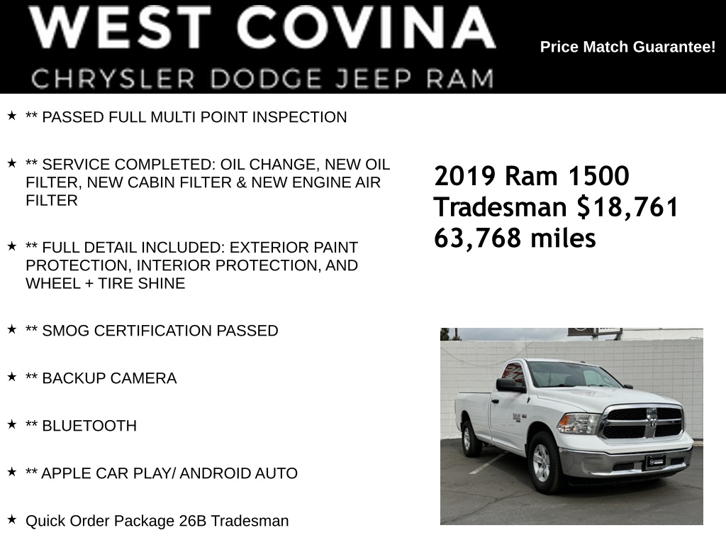 SPRING SALES BLOW OUT EVENT STARTS TODAY!!! COME CHECK OUT OUR HARD TO BEAT INVENTORY PRICES THAT HAVE BEEN SLASHED TO SAVE YOU MONEY. CALL (626) 899-9302 TO GET MORE INFORMATION** REAR SLIDING WINDOW **** PARK VIEW REAR BACK-UP CAMERA **** CHROME APPEARANCE GROUP **WE SPECIALIZE IN ALL CREDIT PROFILES! See what we can do for you! Call to find out (626) 899-9302.Recent Arrival! Clean CARFAX.** PASSED FULL MULTI POINT INSPECTION, ** SERVICE COMPLETED: OIL CHANGE, NEW OIL FILTER, NEW CABIN FILTER & NEW ENGINE AIR FILTER, ** FULL DETAIL INCLUDED: EXTERIOR PAINT PROTECTION, INTERIOR PROTECTION, AND WHEEL + TIRE SHINE, ** SMOG CERTIFICATION PASSED, ** BACKUP CAMERA, ** BLUETOOTH, ** APPLE CAR PLAY/ ANDROID AUTO.Bright White Clearcoat2019 Ram 1500 Classic Tradesman RWD 8-Speed Automatic HEMI 5.7L V8 Multi Displacement VVT**********All Pricing and Advertised Prices for any/all vehicles offered for sale does not include dealer installed accessories which can be purchased for an additional cost.********** The Factory Rebates may not be available on this vehicle if you elect to take advantage of a Special Alternative APR or Special Lease program. Some Factory Rebates are California Resident specific and may vary for residents of other states. NO sales to Dealers, Brokers or Exporters. For out of state purchase, customers must be present to purchase. If shipping is required, dealership must facilitate; no exceptions. Please contact us for special Multi-Vehicle or Fleet pricing. Prices are plus government fees and taxes, any finance charges, $85 documentary fee, $29 electronic registration fee, any emission testing charge and $1.75 per new tire state tire fee. *** We make every effort to provide accurate information, but please verify before purchasing. Leasing & financing available on approved credit. Trade-ins accepted. Subject to prior sale.Awards: * Motor Trend Automobiles of the year