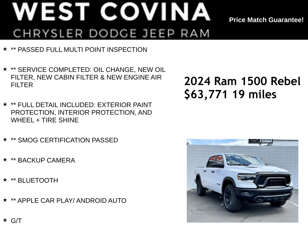 ** PASSED FULL MULTI POINT INSPECTION, ** SERVICE COMPLETED: OIL CHANGE, NEW OIL FILTER, NEW CABIN FILTER & NEW ENGINE AIR FILTER, ** FULL DETAIL INCLUDED: EXTERIOR PAINT PROTECTION, INTERIOR PROTECTION, AND WHEEL + TIRE SHINE, ** SMOG CERTIFICATION PASSED, ** BACKUP CAMERA, ** BLUETOOTH, ** APPLE CAR PLAY/ ANDROID AUTO, G/T.Bright White Clearcoat2024 Ram 1500 Rebel 4WD 8-Speed Automatic HEMI 5.7L V8 Multi Displacement VVT eTorque Price includes: $2500 - 2024 National Retail Consumer Cash . Exp. 07/01/2024
