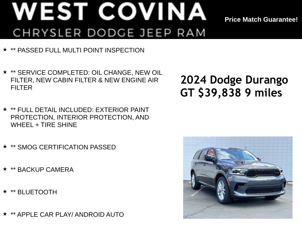 ** Additional Savings may be available to certain groups or individuals. Please contact us to see if you qualify. *Net Cost includes a Factory Rebate, if applicable, on this vehicle and is valid on a cash or financed purchase only by an individual for their personal use. The sale price or net cost does not apply to a lease. *All Pricing and Advertised Prices for any/all vehicles offered for sale does not include dealer installed accessories. *The Factory Rebates may not be available on this vehicle if you elect to take advantage of a Special Alternative APR or Special Lease program. Some Factory Rebates are California Resident specific and may vary for residents of other states. We Only Provide 4 Gallons of Gas at Purchase. *No sales to Dealers, Brokers or Exporters. No out of state purchase, customers must be present to purchase. Please contact us for special Multi-Vehicle or Fleet pricing. Prices are plus government fees and taxes, any finance charges, $85 documentary fee, $33 electronic registration fee, any emission testing charge and $1.75 per new tire state tire fee. All vehicles are subject to prior sale. *While every reasonable effort is made to ensure the accuracy of this information, we are not responsible for any errors or omissions contained on these pages. Leasing & financing available on approved credit. Trade-ins accepted. The estimated selling price that appears after calculating dealer offers is for informational purposes, only. You may not qualify for the offers, incentives, discounts, or financing. Offers, incentives, discounts, or financing are subject to expiration and other restrictions. See dealer for qualifications and complete details. *Images, prices, and options shown, including vehicle color, trim, options, pricing and other specifications are subject to availability, incentive offerings, current pricing and credit worthiness.19/26 City/Highway MPG ** PASSED FULL MULTI POINT INSPECTION, ** SERVICE COMPLETED: OIL CHANGE, NEW OIL FILTER, NEW CABIN FILTER & NEW ENGINE AIR FILTER, ** FULL DETAIL INCLUDED: EXTERIOR PAINT PROTECTION, INTERIOR PROTECTION, AND WHEEL + TIRE SHINE, ** SMOG CERTIFICATION PASSED, ** BACKUP CAMERA, ** BLUETOOTH, ** APPLE CAR PLAY/ ANDROID AUTO.Vapor Gray2024 Dodge Durango GT RWD 8-Speed Automatic 3.6L V6 24V VVT**********All Pricing and Advertised Prices for any/all vehicles offered for sale does not include dealer installed accessories which can be purchased for an additional cost.********** The Factory Rebates may not be available on this vehicle if you elect to take advantage of a Special Alternative APR or Special Lease program. Some Factory Rebates are California Resident specific and may vary for residents of other states. NO sales to Dealers, Brokers or Exporters. For out of state purchase, customers must be present to purchase. If shipping is required, dealership must facilitate; no exceptions. Please contact us for special Multi-Vehicle or Fleet pricing. Prices are plus government fees and taxes, any finance charges, $85 documentary fee, $29 electronic registration fee, any emission testing charge and $1.75 per new tire state tire fee. *** We make every effort to provide accurate information, but please verify before purchasing. Leasing & financing available on approved credit. Trade-ins accepted. Subject to prior sale.