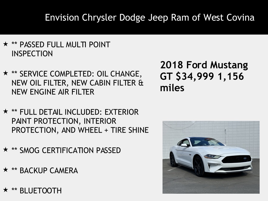 EASTER SALES BLOW OUT EVENT STARTS TODAY!!! COME CHECK OUT OUR HARD TO BEAT INVENTORY PRICES THAT HAVE BEEN SLASHED TO SAVE YOU MONEY. CALL (626) 899-9302 TO GET MORE INFORMATION** LOW MILES **** REAR VIEW CAMERA **** BLCK ACCENT PACKAGE **** GT COUPE **** 6 SPEED MANUAL TRANSMISSION **WE SPECIALIZE IN ALL CREDIT PROFILES! See what we can do for you! Call to find out (626) 899-9302.Recent Arrival! CARFAX One-Owner. Clean CARFAX.** PASSED FULL MULTI POINT INSPECTION, ** SERVICE COMPLETED: OIL CHANGE, NEW OIL FILTER, NEW CABIN FILTER & NEW ENGINE AIR FILTER, ** FULL DETAIL INCLUDED: EXTERIOR PAINT PROTECTION, INTERIOR PROTECTION, AND WHEEL + TIRE SHINE, ** SMOG CERTIFICATION PASSED, ** BACKUP CAMERA, ** BLUETOOTH, ** APPLE CAR PLAY/ ANDROID AUTO.White2018 Ford Mustang GT RWD 6-Speed Manual 5.0L V8 Ti-VCT**********All Pricing and Advertised Prices for any/all vehicles offered for sale does not include dealer installed accessories which can be purchased for an additional cost.********** The Factory Rebates may not be available on this vehicle if you elect to take advantage of a Special Alternative APR or Special Lease program. Some Factory Rebates are California Resident specific and may vary for residents of other states. NO sales to Dealers, Brokers or Exporters. For out of state purchase, customers must be present to purchase. If shipping is required, dealership must facilitate; no exceptions. Please contact us for special Multi-Vehicle or Fleet pricing. Prices are plus government fees and taxes, any finance charges, $85 documentary fee, $29 electronic registration fee, any emission testing charge and $1.75 per new tire state tire fee. *** We make every effort to provide accurate information, but please verify before purchasing. Leasing & financing available on approved credit. Trade-ins accepted. Subject to prior sale.Awards: * 2018 KBB.com 10 Coolest Cars Under $25,000 * 2018 KBB.com Brand Image Awards * 2018 KBB.com 10 Most Awarded Brands