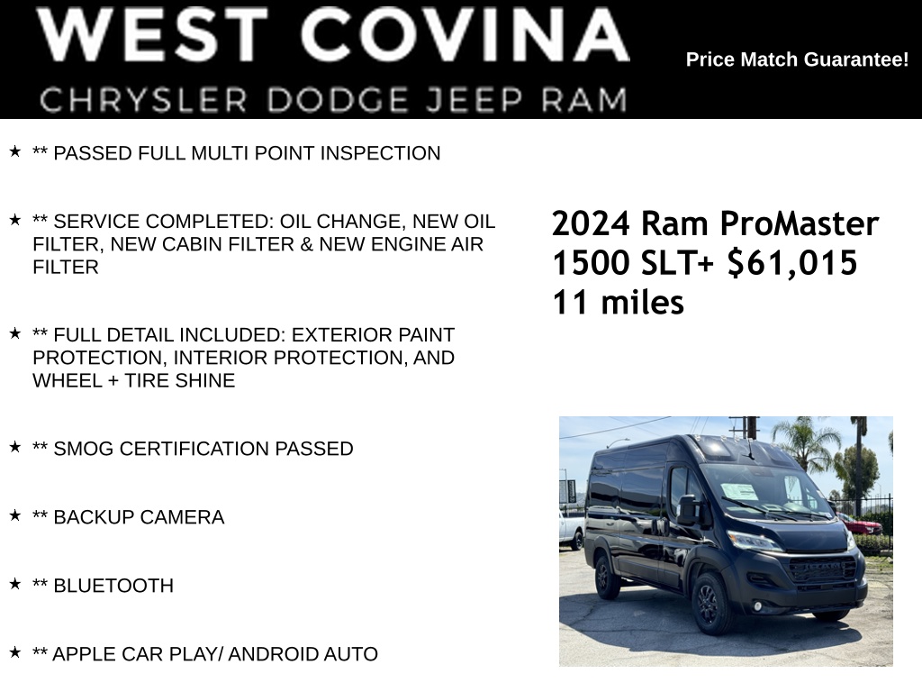 ** PASSED FULL MULTI POINT INSPECTION, ** SERVICE COMPLETED: OIL CHANGE, NEW OIL FILTER, NEW CABIN FILTER & NEW ENGINE AIR FILTER, ** FULL DETAIL INCLUDED: EXTERIOR PAINT PROTECTION, INTERIOR PROTECTION, AND WHEEL + TIRE SHINE, ** SMOG CERTIFICATION PASSED, ** BACKUP CAMERA, ** BLUETOOTH, ** APPLE CAR PLAY/ ANDROID AUTO.Black Clearcoat2024 Ram ProMaster 1500 FWD 9-Speed 948TE Automatic 3.6L V6 24V VVT