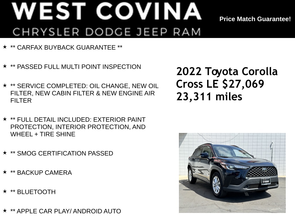 SPRING SALES BLOW OUT EVENT STARTS TODAY!!! COME CHECK OUT OUR HARD TO BEAT INVENTORY PRICES THAT HAVE BEEN SLASHED TO SAVE YOU MONEY. CALL (626) 899-9302 TO GET MORE INFORMATION** CRUISE CONTROL STEERING ASSIST **** BACK-UP CAMERA **WE SPECIALIZE IN ALL CREDIT PROFILES! See what we can do for you! Call to find out (626) 899-9302.Recent Arrival! Clean CARFAX.31/33 City/Highway MPG ** PASSED FULL MULTI POINT INSPECTION, ** SERVICE COMPLETED: OIL CHANGE, NEW OIL FILTER, NEW CABIN FILTER & NEW ENGINE AIR FILTER, ** FULL DETAIL INCLUDED: EXTERIOR PAINT PROTECTION, INTERIOR PROTECTION, AND WHEEL + TIRE SHINE, ** SMOG CERTIFICATION PASSED, ** BACKUP CAMERA, ** BLUETOOTH, ** APPLE CAR PLAY/ ANDROID AUTO.Black2022 Toyota Corolla Cross LE FWD CVT 2.0L I4 PDI DOHC 16V LEV3-SULEV30 169hp**********All Pricing and Advertised Prices for any/all vehicles offered for sale does not include dealer installed accessories which can be purchased for an additional cost.********** The Factory Rebates may not be available on this vehicle if you elect to take advantage of a Special Alternative APR or Special Lease program. Some Factory Rebates are California Resident specific and may vary for residents of other states. NO sales to Dealers, Brokers or Exporters. For out of state purchase, customers must be present to purchase. If shipping is required, dealership must facilitate; no exceptions. Please contact us for special Multi-Vehicle or Fleet pricing. Prices are plus government fees and taxes, any finance charges, $85 documentary fee, $29 electronic registration fee, any emission testing charge and $1.75 per new tire state tire fee. *** We make every effort to provide accurate information, but please verify before purchasing. Leasing & financing available on approved credit. Trade-ins accepted. Subject to prior sale.
