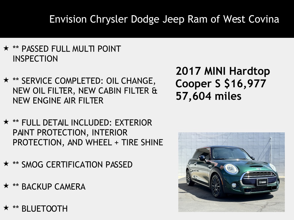 SPRING SALES BLOW OUT EVENT STARTS TODAY!!! COME CHECK OUT OUR HARD TO BEAT INVENTORY PRICES THAT HAVE BEEN SLASHED TO SAVE YOU MONEY. CALL (626) 899-9302 TO GET MORE INFORMATIONWE SPECIALIZE IN ALL CREDIT PROFILES! See what we can do for you! Call to find out (626) 899-9302.Recent Arrival! Clean CARFAX.Odometer is 1624 miles below market average! 23/32 City/Highway MPG ** PASSED FULL MULTI POINT INSPECTION, ** SERVICE COMPLETED: OIL CHANGE, NEW OIL FILTER, NEW CABIN FILTER & NEW ENGINE AIR FILTER, ** FULL DETAIL INCLUDED: EXTERIOR PAINT PROTECTION, INTERIOR PROTECTION, AND WHEEL + TIRE SHINE, ** SMOG CERTIFICATION PASSED, ** BACKUP CAMERA, ** BLUETOOTH, ** APPLE CAR PLAY/ ANDROID AUTO.British Racing Green Metallic2017 MINI Cooper S FWD 7-Speed Automatic 2.0L 16V TwinPower Turbo**********All Pricing and Advertised Prices for any/all vehicles offered for sale does not include dealer installed accessories which can be purchased for an additional cost.********** The Factory Rebates may not be available on this vehicle if you elect to take advantage of a Special Alternative APR or Special Lease program. Some Factory Rebates are California Resident specific and may vary for residents of other states. NO sales to Dealers, Brokers or Exporters. For out of state purchase, customers must be present to purchase. If shipping is required, dealership must facilitate; no exceptions. Please contact us for special Multi-Vehicle or Fleet pricing. Prices are plus government fees and taxes, any finance charges, $85 documentary fee, $29 electronic registration fee, any emission testing charge and $1.75 per new tire state tire fee. *** We make every effort to provide accurate information, but please verify before purchasing. Leasing & financing available on approved credit. Trade-ins accepted. Subject to prior sale.Awards: * JD Power Initial Quality Study (IQS) * JD Power Automotive Performance, Execution and Layout (APEAL) Study, Initial Quality Study (IQS) * 2017 IIHS Top Safety PickReviews: * All available engines blend quickness and fuel efficiency; nimble handling helps keep the Mini glued to the road; lots of available add-ons mean a high degree of personalization; interior looks classy and upscale. Source: Edmunds