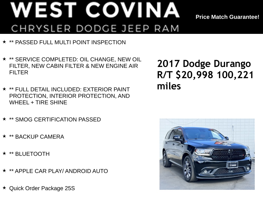 SPRING SALES BLOW OUT EVENT STARTS TODAY!!! COME CHECK OUT OUR HARD TO BEAT INVENTORY PRICES THAT HAVE BEEN SLASHED TO SAVE YOU MONEY. CALL (626) 899-9302 TO GET MORE INFORMATION** TECHNOLOGY GROUP **** LUXURY LEATHER-TRIMMED BUCKET SEATS **** 5.7-LITER V8 HEMI **** GPS NAVIGATION **WE SPECIALIZE IN ALL CREDIT PROFILES! See what we can do for you! Call to find out (626) 899-9302.Recent Arrival!** PASSED FULL MULTI POINT INSPECTION, ** SERVICE COMPLETED: OIL CHANGE, NEW OIL FILTER, NEW CABIN FILTER & NEW ENGINE AIR FILTER, ** FULL DETAIL INCLUDED: EXTERIOR PAINT PROTECTION, INTERIOR PROTECTION, AND WHEEL + TIRE SHINE, ** SMOG CERTIFICATION PASSED, ** BACKUP CAMERA, ** BLUETOOTH, ** APPLE CAR PLAY/ ANDROID AUTO, AWD.DB Black Crystal Clearcoat2017 Dodge Durango R/T AWD 8-Speed Automatic HEMI 5.7L V8 Multi Displacement VVT**********All Pricing and Advertised Prices for any/all vehicles offered for sale does not include dealer installed accessories which can be purchased for an additional cost.********** The Factory Rebates may not be available on this vehicle if you elect to take advantage of a Special Alternative APR or Special Lease program. Some Factory Rebates are California Resident specific and may vary for residents of other states. NO sales to Dealers, Brokers or Exporters. For out of state purchase, customers must be present to purchase. If shipping is required, dealership must facilitate; no exceptions. Please contact us for special Multi-Vehicle or Fleet pricing. Prices are plus government fees and taxes, any finance charges, $85 documentary fee, $29 electronic registration fee, any emission testing charge and $1.75 per new tire state tire fee. *** We make every effort to provide accurate information, but please verify before purchasing. Leasing & financing available on approved credit. Trade-ins accepted. Subject to prior sale.Reviews: * Unusually spacious third-row seats; 8.4-inch touchscreen is one of the best in the class; assertive acceleration with the V8 engine; exceptional towing capacity for a crossover; real off-road capabilities with 4WD and low-range gearing. Source: Edmunds