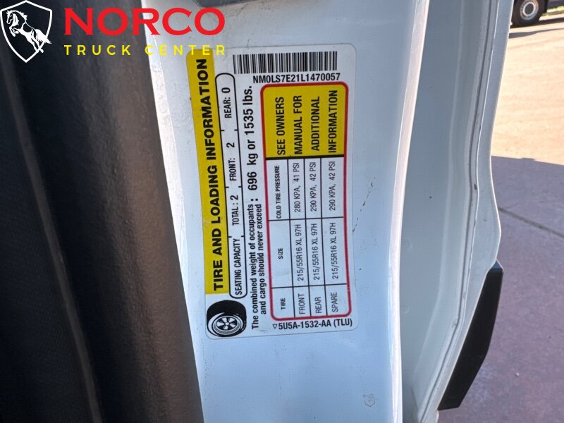 -- INSTALLED FEATURES: Air filtration, Front air conditioning, Front air conditioning zones: single, Airbag deactivation: occupant sensing passenger, Front airbags: dual, Side airbags: front, Side curtain airbags: front, Antenna type: mast, Auxiliary audio input: Bluetooth / USB / jack, Radio: AM/FM, Total speakers: 4, ABS: 4-wheel, Braking assist, Electronic brakeforce distribution, Emergency braking preparation, Front brake diameter: 12.6, Front brake type: ventilated disc, Power brakes, Rear brake diameter: 11.0, Rear brake type: disc, Door trim: cloth, Floor material: rubber/vinyl, Shift knob trim: urethane, Steering wheel trim: urethane, Assist handle: front, Capless fuel filler system, Cargo area light, Center console: front console with armrest and storage, Cupholders: front / 2, Multi-function remote: keyless entry / panic alarm / trunk release, One-touch windows: 1, Overhead console: front, Power outlet(s): 12V cargo area / 12V front, Power steering, Steering wheel: tilt and telescopic, Storage: cargo tie-down anchors and hooks / door pockets, Sun visors, Axle ratio: 3.80, Drive mode selector, Alternator: 150 amps, Auto start/stop, Battery: maintenance-free, Battery rating: 800 CCA, Battery saver, Body side moldings: black, Door handle color: black, Front bumper color: black, Grille color: black / black surround, Headlight bezel color: black, Mirror color: black, Rear bumper color: black, Rear trunk/liftgate: barn, Side door type: dual manual sliding, Window trim: black, Infotainment screen size: 4.2 in., Clock, Digital odometer, External temperature display, Fuel economy display: MPG / range, Gauge: tachometer, Instrument cluster screen size: 4.2 in., Multi-function display, Trip odometer, Warnings and reminders: low fuel level / maintenance due, Daytime running lights, Headlights: auto on/off / halogen / wiper activated, Side mirror adjustments: manual / manual folding, OEM roof height: undefined, Automatic emergency braking: front, Camera system: rearview, Pre-collision warning system: audible warning / pedestrian detection / visual warning, Rearview monitor: in dash, Emergency locking retractors: front, Front seatbelts: 3-point, Seatbelt pretensioners: front, Seatbelt warning sensor: front, Driver seat manual adjustments: height / reclining / 6, Front headrests: adjustable / 2, Front seat type: bucket, Passenger seat folding: folds flat, Passenger seat manual adjustments: reclining / 4, Upholstery: vinyl, Anti-theft system: vehicle immobilizer, Power door locks: auto-locking, Crosswind stabilization, Hill holder control, Roll stability control, Stability control, Traction control, Front shock type: gas, Front spring type: coil, Front stabilizer bar, Front struts: MacPherson, Front suspension classification: independent, Front suspension type: lower control arms, Rear shock type: gas, Rear spring type: coil, Rear suspension classification: semi-independent, Rear suspension type: torsion beam, Smart device app compatibility: FordPass Connect, Smart device app function: engine start / lock operation / maintenance status / vehicle location, Wi-Fi: hotspot, Wireless data link: Bluetooth, Spare tire mount location: underbody, Spare tire size: full-size, Spare wheel type: steel, Tire Pressure Monitoring System, Tire type: all season, Wheel covers: full, Wheels: painted steel, Front wipers: rain sensing / variable intermittent, Power windows: front, Solar-tinted glass