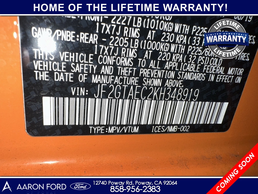 17" Alloy Wheels, Blind Spot Detection/Rear Cross Traffic Alert, Cloth Upholstery, Exterior Parking Camera Rear, EyeSight System, Fully automatic headlights, Heated Front Bucket Seats, High Grade Instrument Cluster w/Color LCD Display, Radio: Subaru Starlink 6.5" Multimedia Plus System, STARLINK/Apple CarPlay/Android Auto, Subaru Starlink Smartphone Integration.Odometer is 26657 miles below market average!27/33 City/Highway MPGClean CARFAX.To see more quality vehicles like this one right just click on AaronFordofPoway.com or dial (858) 748-1400.Awards: * ALG Residual Value Awards, Residual Value Awards * 2019 KBB.com 10 Best SUVs Under $30,000 * 2019 KBB.com Our 10 Most Awarded Cars of 2019 * 2019 KBB.com 5-Year Cost to Own Awards * 2019 KBB.com 10 Best All-Wheel-Drive Vehicles Under $30,000 * 2019 KBB.com Best Resale Value Awards * 2019 KBB.com Brand Image Awards