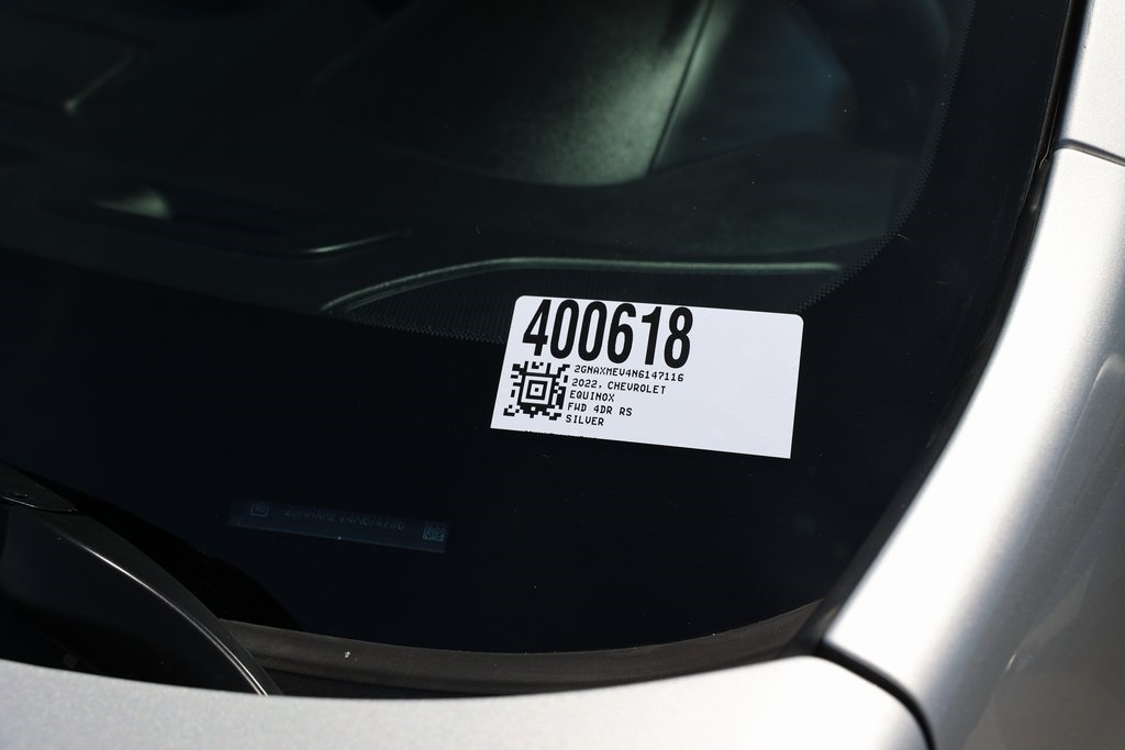 Silver Ice Metallic 2022 Chevrolet Equinox RS FWD 6-Speed Automatic Electronic with Overdrive 1.5L DOHC 120-Volt Power Outlet, 19" Aluminum Wheels, 2 USB Data Ports, 2 USB Data Ports w/SD Card Reader, Adaptive Cruise Control, Advanced Safety Package, Bose Premium 7-Speaker Audio System Feature, Cargo Package (LPO), Driver Seatback Map Pocket, Fully automatic headlights, HD Surround Vision, Heated Steering Wheel, Infotainment Package, Navigation System, Not Equipped w/Driver & Fr Pass Heated Seats, Outside Heated Power Adjustable Mirrors, Perforated Leather-Appointed Seat Trim, Power Liftgate, Preferred Equipment Group 1RS, Radio: Chevrolet Infotainment 3 Plus System w/Navi, Retractable Cargo Shade, RS Leather Package, Vertical Cargo Net (LPO), Wireless Apple CarPlay/Wireless Android Auto.Recent Arrival! 26/31 City/Highway MPG