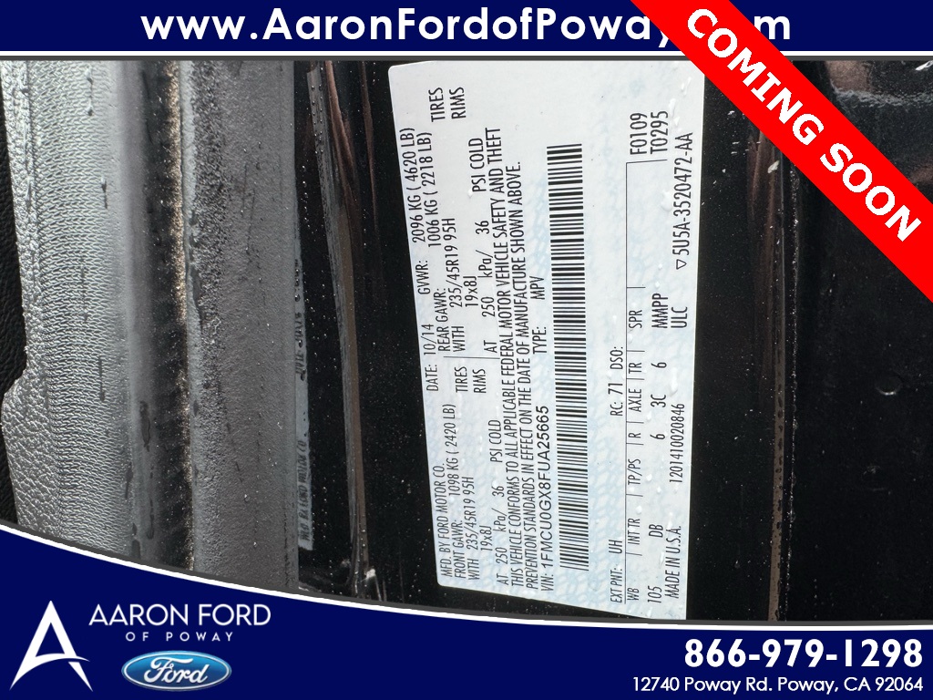 Black Roof Side Rails, Dual Zone Electronic Automatic Temperature Control, Equipment Group 201A, Exterior Parking Camera Rear, Fully automatic headlights, Navigation System, Perimeter Alarm, Power Converter 110V Outlet, Radio: Media Hub w/SYNC w/MyFord Touch, Reverse Sensing System, SE Convenience Package, SYNC w/MyFord Touch & SYNC Services, Voice Activated Navigation, Wheels: 19" Chrome.23/32 City/Highway MPGClean CARFAX.To see more quality vehicles like this one right just click on AaronFordofPoway.com or dial (858) 748-1400.Awards: * JD Power Initial Quality Study (IQS) * 2015 KBB.com 10 Best SUVs Under $25,000 * 2015 KBB.com Brand Image Awards