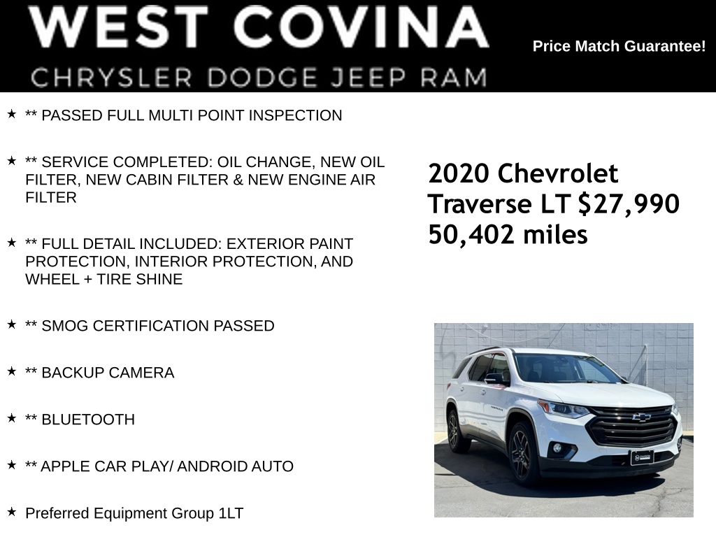 SPRING SALES BLOW OUT EVENT STARTS TODAY!!! COME CHECK OUT OUR HARD TO BEAT INVENTORY PRICES THAT HAVE BEEN SLASHED TO SAVE YOU MONEY. CALL (626) 899-9302 TO GET MORE INFORMATION** CONFIDENCE PACKAGE **** BLACKOUT PACKAGE **** CARGO PACKAGE **WE SPECIALIZE IN ALL CREDIT PROFILES! See what we can do for you! Call to find out (626) 899-9302.Recent Arrival! Clean CARFAX.18/27 City/Highway MPG ** PASSED FULL MULTI POINT INSPECTION, ** SERVICE COMPLETED: OIL CHANGE, NEW OIL FILTER, NEW CABIN FILTER & NEW ENGINE AIR FILTER, ** FULL DETAIL INCLUDED: EXTERIOR PAINT PROTECTION, INTERIOR PROTECTION, AND WHEEL + TIRE SHINE, ** SMOG CERTIFICATION PASSED, ** BACKUP CAMERA, ** BLUETOOTH, ** APPLE CAR PLAY/ ANDROID AUTO.Summit White2020 Chevrolet Traverse LT FWD 9-Speed Automatic 3.6L V6 SIDI VVT**********All Pricing and Advertised Prices for any/all vehicles offered for sale does not include dealer installed accessories which can be purchased for an additional cost.********** The Factory Rebates may not be available on this vehicle if you elect to take advantage of a Special Alternative APR or Special Lease program. Some Factory Rebates are California Resident specific and may vary for residents of other states. NO sales to Dealers, Brokers or Exporters. For out of state purchase, customers must be present to purchase. If shipping is required, dealership must facilitate; no exceptions. Please contact us for special Multi-Vehicle or Fleet pricing. Prices are plus government fees and taxes, any finance charges, $85 documentary fee, $29 electronic registration fee, any emission testing charge and $1.75 per new tire state tire fee. *** We make every effort to provide accurate information, but please verify before purchasing. Leasing & financing available on approved credit. Trade-ins accepted. Subject to prior sale.