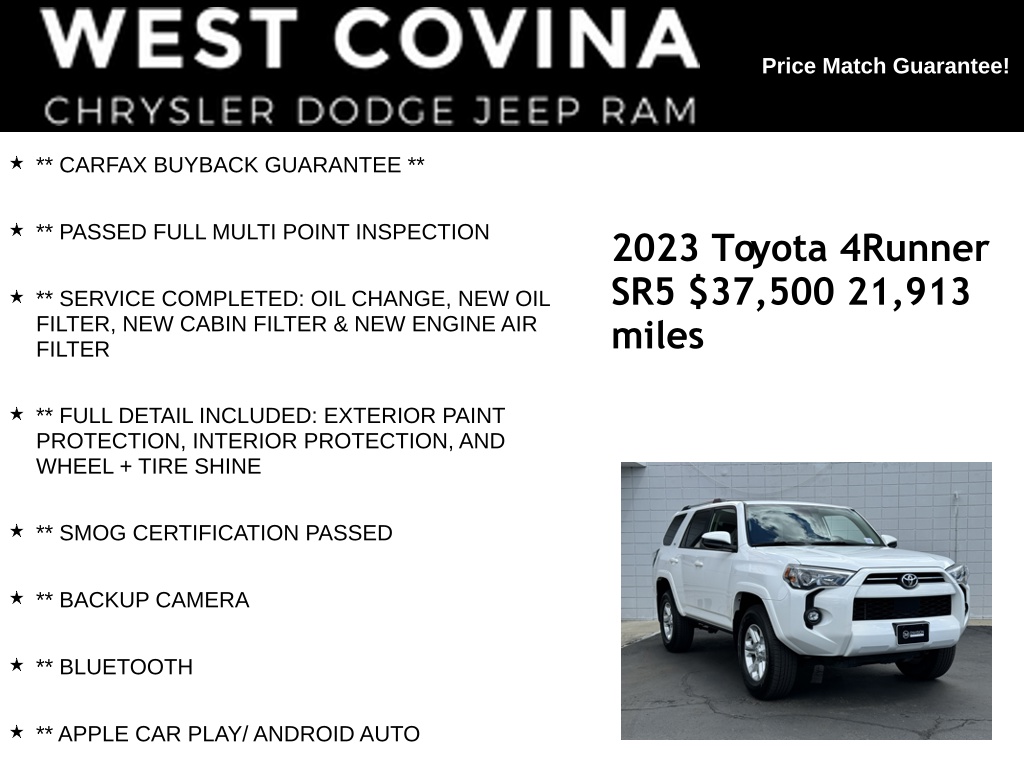 MEMORIAL DAY SALES EVENT HAS STARTED!!! COME CHECK OUT OUR HARD TO BEAT INVENTORY PRICES THAT HAVE BEEN REDUCED TO SAVE YOU MONEY. CALL (626) 899-9302 TO GET MORE INFORMATION** THIRD ROW SEATING **** BACK-UP CAMERA **** LANE DEPARTURE ALERT **** BLIND SPOT MONITOR **** AUTO LOCKING HUBS **WE SPECIALIZE IN ALL CREDIT PROFILES! See what we can do for you! Call to find out (626) 899-9302.Recent Arrival! CARFAX One-Owner. Clean CARFAX.** PASSED FULL MULTI POINT INSPECTION, ** SERVICE COMPLETED: OIL CHANGE, NEW OIL FILTER, NEW CABIN FILTER & NEW ENGINE AIR FILTER, ** FULL DETAIL INCLUDED: EXTERIOR PAINT PROTECTION, INTERIOR PROTECTION, AND WHEEL + TIRE SHINE, ** SMOG CERTIFICATION PASSED, ** BACKUP CAMERA, ** BLUETOOTH, ** APPLE CAR PLAY/ ANDROID AUTO, 4WD.White2023 Toyota 4Runner SR5 4WD 5-Speed with ECT 4.0L V6 DOHC 24V**********All Pricing and Advertised Prices for any/all vehicles offered for sale does not include dealer installed accessories which can be purchased for an additional cost.********** The Factory Rebates may not be available on this vehicle if you elect to take advantage of a Special Alternative APR or Special Lease program. Some Factory Rebates are California Resident specific and may vary for residents of other states. NO sales to Dealers, Brokers or Exporters. For out of state purchase, customers must be present to purchase. If shipping is required, dealership must facilitate; no exceptions. Please contact us for special Multi-Vehicle or Fleet pricing. Prices are plus government fees and taxes, any finance charges, $85 documentary fee, $29 electronic registration fee, any emission testing charge and $1.75 per new tire state tire fee. *** We make every effort to provide accurate information, but please verify before purchasing. Leasing & financing available on approved credit. Trade-ins accepted. Subject to prior sale.