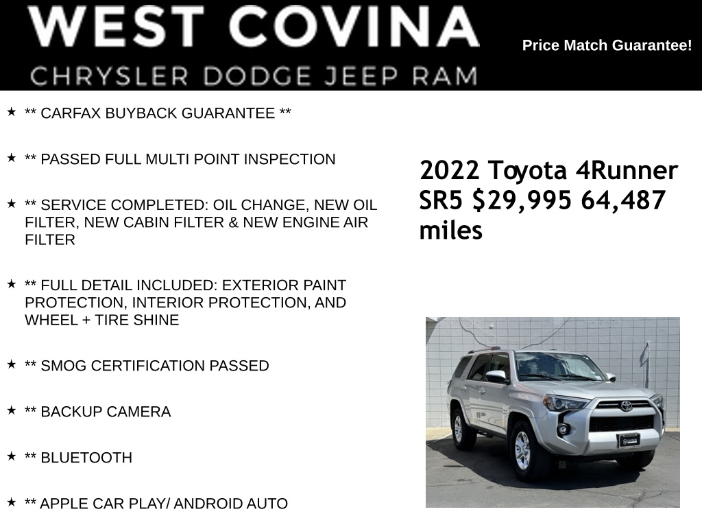 SPRING SALES BLOW OUT EVENT STARTS TODAY!!! COME CHECK OUT OUR HARD TO BEAT INVENTORY PRICES THAT HAVE BEEN SLASHED TO SAVE YOU MONEY. CALL (626) 899-9302 TO GET MORE INFORMATION** THIRD ROW SEATING **** BACK-UP CAMERA **** LANE DEPARTURE ALERT **WE SPECIALIZE IN ALL CREDIT PROFILES! See what we can do for you! Call to find out (626) 899-9302.Recent Arrival! CARFAX One-Owner. Clean CARFAX.** PASSED FULL MULTI POINT INSPECTION, ** SERVICE COMPLETED: OIL CHANGE, NEW OIL FILTER, NEW CABIN FILTER & NEW ENGINE AIR FILTER, ** FULL DETAIL INCLUDED: EXTERIOR PAINT PROTECTION, INTERIOR PROTECTION, AND WHEEL + TIRE SHINE, ** SMOG CERTIFICATION PASSED, ** BACKUP CAMERA, ** BLUETOOTH, ** APPLE CAR PLAY/ ANDROID AUTO.Silver2022 Toyota 4Runner SR5 RWD 5-Speed with ECT 4.0L V6 DOHC 24V**********All Pricing and Advertised Prices for any/all vehicles offered for sale does not include dealer installed accessories which can be purchased for an additional cost.********** The Factory Rebates may not be available on this vehicle if you elect to take advantage of a Special Alternative APR or Special Lease program. Some Factory Rebates are California Resident specific and may vary for residents of other states. NO sales to Dealers, Brokers or Exporters. For out of state purchase, customers must be present to purchase. If shipping is required, dealership must facilitate; no exceptions. Please contact us for special Multi-Vehicle or Fleet pricing. Prices are plus government fees and taxes, any finance charges, $85 documentary fee, $29 electronic registration fee, any emission testing charge and $1.75 per new tire state tire fee. *** We make every effort to provide accurate information, but please verify before purchasing. Leasing & financing available on approved credit. Trade-ins accepted. Subject to prior sale.