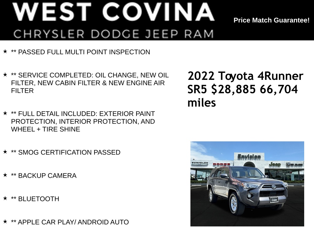 INDEPENDENCE DAY CELEBRATION HAS BEGUN. COME CHECK OUT OUR HARD TO BEAT INVENTORY PRICES. CALL (626) 899-9302 TO GET MORE INFORMATION** BACK-UP CAMERA **** LANE DEPARTURE ALERT **** LIP SPOILER **WE SPECIALIZE IN ALL CREDIT PROFILES! See what we can do for you! Call to find out (626) 899-9302.Recent Arrival! CARFAX One-Owner. Clean CARFAX.** PASSED FULL MULTI POINT INSPECTION, ** SERVICE COMPLETED: OIL CHANGE, NEW OIL FILTER, NEW CABIN FILTER & NEW ENGINE AIR FILTER, ** FULL DETAIL INCLUDED: EXTERIOR PAINT PROTECTION, INTERIOR PROTECTION, AND WHEEL + TIRE SHINE, ** SMOG CERTIFICATION PASSED, ** BACKUP CAMERA, ** BLUETOOTH, ** APPLE CAR PLAY/ ANDROID AUTO.Magnetic Gray Metallic2022 Toyota 4Runner SR5 RWD 5-Speed with ECT 4.0L V6 DOHC 24V**********All Pricing and Advertised Prices for any/all vehicles offered for sale does not include dealer installed accessories which can be purchased for an additional cost.********** The Factory Rebates may not be available on this vehicle if you elect to take advantage of a Special Alternative APR or Special Lease program. Some Factory Rebates are California Resident specific and may vary for residents of other states. NO sales to Dealers, Brokers or Exporters. For out of state purchase, customers must be present to purchase. If shipping is required, dealership must facilitate; no exceptions. Please contact us for special Multi-Vehicle or Fleet pricing. Prices are plus government fees and taxes, any finance charges, $85 documentary fee, $29 electronic registration fee, any emission testing charge and $1.75 per new tire state tire fee. *** We make every effort to provide accurate information, but please verify before purchasing. Leasing & financing available on approved credit. Trade-ins accepted. Subject to prior sale.