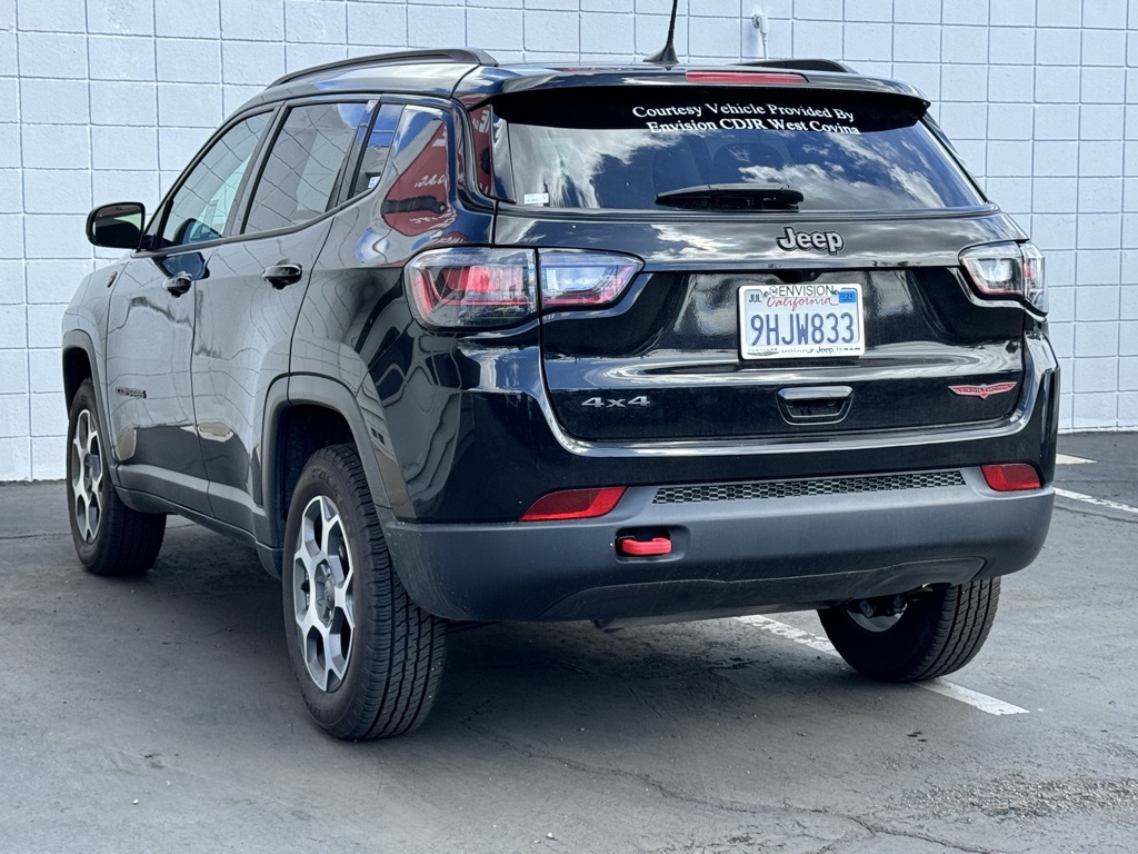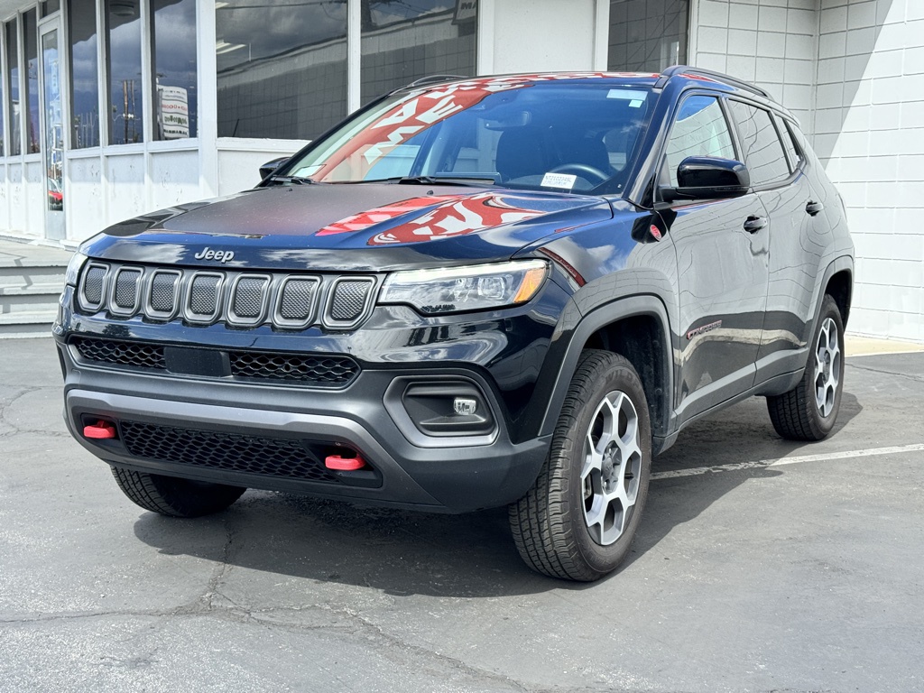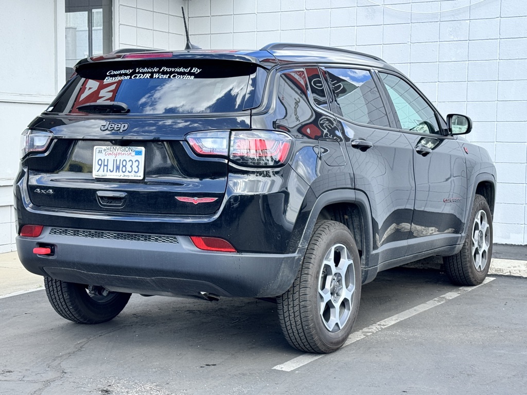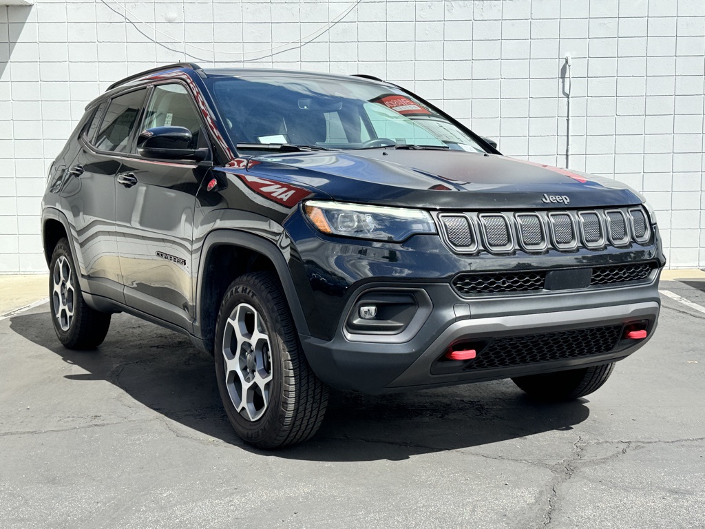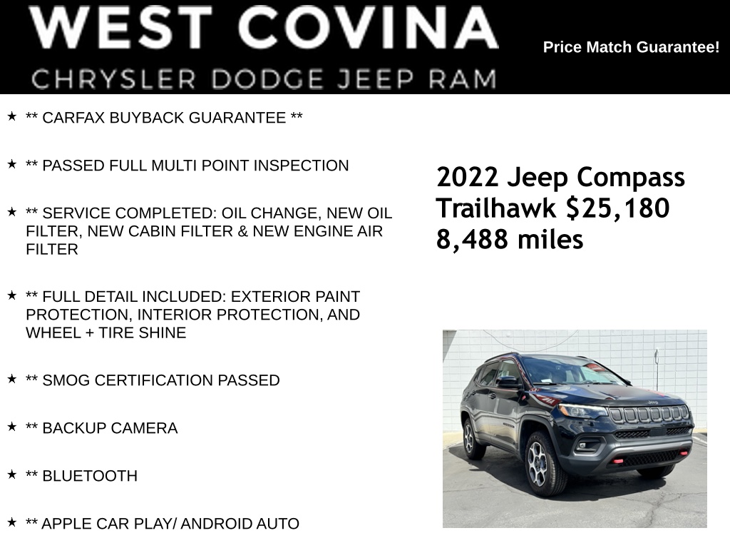 MEMORIAL DAY SALES EVENT HAS STARTED!!! COME CHECK OUT OUR HARD TO BEAT INVENTORY PRICES THAT HAVE BEEN REDUCED TO SAVE YOU MONEY. CALL (626) 899-9302 TO GET MORE INFORMATION** DUAL-PANE PANORAMIC SUNROOF **** POWER LIFTGATE **** TRAILHAWK ELITE GROUP **WE SPECIALIZE IN ALL CREDIT PROFILES! See what we can do for you! Call to find out (626) 899-9302.Recent Arrival! Clean CARFAX.22/30 City/Highway MPG ** PASSED FULL MULTI POINT INSPECTION, ** SERVICE COMPLETED: OIL CHANGE, NEW OIL FILTER, NEW CABIN FILTER & NEW ENGINE AIR FILTER, ** FULL DETAIL INCLUDED: EXTERIOR PAINT PROTECTION, INTERIOR PROTECTION, AND WHEEL + TIRE SHINE, ** SMOG CERTIFICATION PASSED, ** BACKUP CAMERA, ** BLUETOOTH, ** APPLE CAR PLAY/ ANDROID AUTO, 4WD.Black2022 Jeep Compass Trailhawk 4WD 9-Speed 948TE Automatic 2.4L I4**********All Pricing and Advertised Prices for any/all vehicles offered for sale does not include dealer installed accessories which can be purchased for an additional cost.********** The Factory Rebates may not be available on this vehicle if you elect to take advantage of a Special Alternative APR or Special Lease program. Some Factory Rebates are California Resident specific and may vary for residents of other states. NO sales to Dealers, Brokers or Exporters. For out of state purchase, customers must be present to purchase. If shipping is required, dealership must facilitate; no exceptions. Please contact us for special Multi-Vehicle or Fleet pricing. Prices are plus government fees and taxes, any finance charges, $85 documentary fee, $29 electronic registration fee, any emission testing charge and $1.75 per new tire state tire fee. *** We make every effort to provide accurate information, but please verify before purchasing. Leasing & financing available on approved credit. Trade-ins accepted. Subject to prior sale.