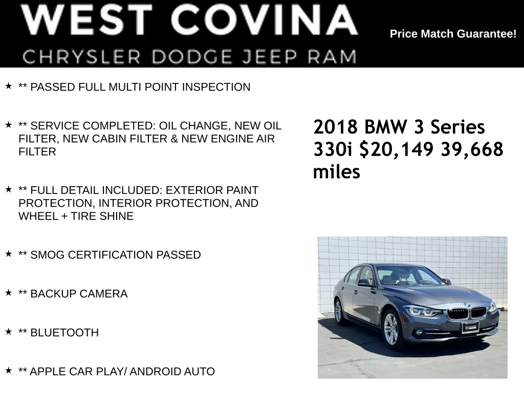 ** POWER FRONT SEATS **** LED FOG LIGHTS **** PARK DISTANCE CONTROL **WE SPECIALIZE IN ALL CREDIT PROFILES! See what we can do for you! Call to find out (626) 899-9302.Recent Arrival!24/34 City/Highway MPG ** PASSED FULL MULTI POINT INSPECTION, ** SERVICE COMPLETED: OIL CHANGE, NEW OIL FILTER, NEW CABIN FILTER & NEW ENGINE AIR FILTER, ** FULL DETAIL INCLUDED: EXTERIOR PAINT PROTECTION, INTERIOR PROTECTION, AND WHEEL + TIRE SHINE, ** SMOG CERTIFICATION PASSED, ** BACKUP CAMERA, ** BLUETOOTH, ** APPLE CAR PLAY/ ANDROID AUTO.Mineral Grey Metallic2018 BMW 3 Series 330i RWD 8-Speed Automatic 2.0L 4-Cylinder DOHC 16V Turbocharged**********All Pricing and Advertised Prices for any/all vehicles offered for sale does not include dealer installed accessories which can be purchased for an additional cost.********** The Factory Rebates may not be available on this vehicle if you elect to take advantage of a Special Alternative APR or Special Lease program. Some Factory Rebates are California Resident specific and may vary for residents of other states. NO sales to Dealers, Brokers or Exporters. For out of state purchase, customers must be present to purchase. If shipping is required, dealership must facilitate; no exceptions. Please contact us for special Multi-Vehicle or Fleet pricing. Prices are plus government fees and taxes, any finance charges, $85 documentary fee, $29 electronic registration fee, any emission testing charge and $1.75 per new tire state tire fee. *** We make every effort to provide accurate information, but please verify before purchasing. Leasing & financing available on approved credit. Trade-ins accepted. Subject to prior sale.