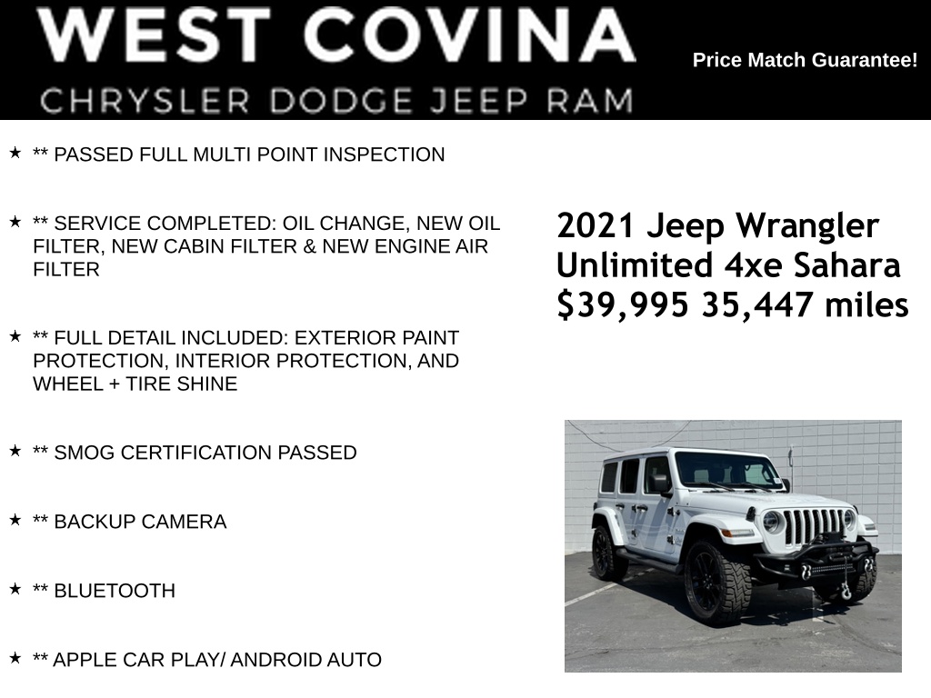 ** NAVIGATION **WE SPECIALIZE IN ALL CREDIT PROFILES! See what we can do for you! Call to find out (626) 899-9302.Recent Arrival! CARFAX One-Owner.** PASSED FULL MULTI POINT INSPECTION, ** SERVICE COMPLETED: OIL CHANGE, NEW OIL FILTER, NEW CABIN FILTER & NEW ENGINE AIR FILTER, ** FULL DETAIL INCLUDED: EXTERIOR PAINT PROTECTION, INTERIOR PROTECTION, AND WHEEL + TIRE SHINE, ** SMOG CERTIFICATION PASSED, ** BACKUP CAMERA, ** BLUETOOTH, ** APPLE CAR PLAY/ ANDROID AUTO, 2.0L I4 DOHC.White2021 Jeep Wrangler Unlimited Sahara 4xe 4WD 8-Speed Automatic 2.0L I4 DOHC**********All Pricing and Advertised Prices for any/all vehicles offered for sale does not include dealer installed accessories which can be purchased for an additional cost.********** The Factory Rebates may not be available on this vehicle if you elect to take advantage of a Special Alternative APR or Special Lease program. Some Factory Rebates are California Resident specific and may vary for residents of other states. NO sales to Dealers, Brokers or Exporters. For out of state purchase, customers must be present to purchase. If shipping is required, dealership must facilitate; no exceptions. Please contact us for special Multi-Vehicle or Fleet pricing. Prices are plus government fees and taxes, any finance charges, $85 documentary fee, $29 electronic registration fee, any emission testing charge and $1.75 per new tire state tire fee. *** We make every effort to provide accurate information, but please verify before purchasing. Leasing & financing available on approved credit. Trade-ins accepted. Subject to prior sale.