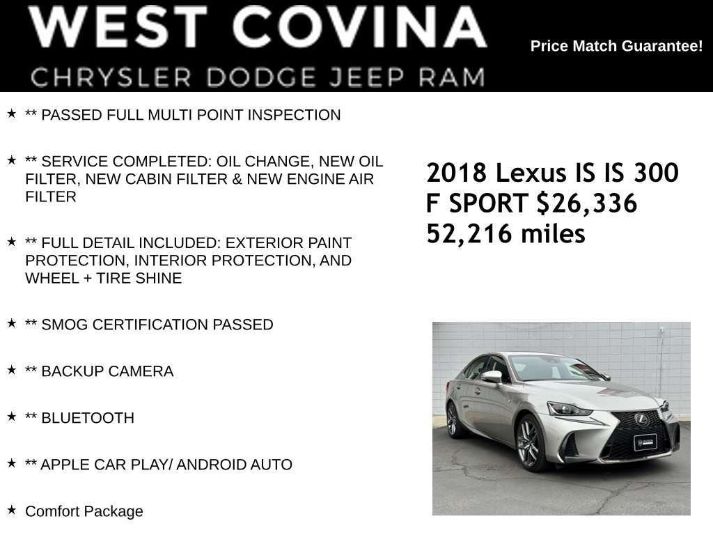 ** F/SPORT PACKAGE **** NAVIGATION **** COMFORT PKG **WE SPECIALIZE IN ALL CREDIT PROFILES! See what we can do for you! Call to find out (626) 899-9302.Recent Arrival! Clean CARFAX.22/32 City/Highway MPG ** PASSED FULL MULTI POINT INSPECTION, ** SERVICE COMPLETED: OIL CHANGE, NEW OIL FILTER, NEW CABIN FILTER & NEW ENGINE AIR FILTER, ** FULL DETAIL INCLUDED: EXTERIOR PAINT PROTECTION, INTERIOR PROTECTION, AND WHEEL + TIRE SHINE, ** SMOG CERTIFICATION PASSED, ** BACKUP CAMERA, ** BLUETOOTH, ** APPLE CAR PLAY/ ANDROID AUTO.Silver2018 Lexus IS 300 RWD 8-Speed Automatic with Direct Shift 2.0L I4 Turbocharged**********All Pricing and Advertised Prices for any/all vehicles offered for sale does not include dealer installed accessories which can be purchased for an additional cost.********** The Factory Rebates may not be available on this vehicle if you elect to take advantage of a Special Alternative APR or Special Lease program. Some Factory Rebates are California Resident specific and may vary for residents of other states. NO sales to Dealers, Brokers or Exporters. For out of state purchase, customers must be present to purchase. If shipping is required, dealership must facilitate; no exceptions. Please contact us for special Multi-Vehicle or Fleet pricing. Prices are plus government fees and taxes, any finance charges, $85 documentary fee, $29 electronic registration fee, any emission testing charge and $1.75 per new tire state tire fee. *** We make every effort to provide accurate information, but please verify before purchasing. Leasing & financing available on approved credit. Trade-ins accepted. Subject to prior sale.Awards: * 2018 KBB.com 10 Most Awarded Brands * 2018 KBB.com Brand Image Awards