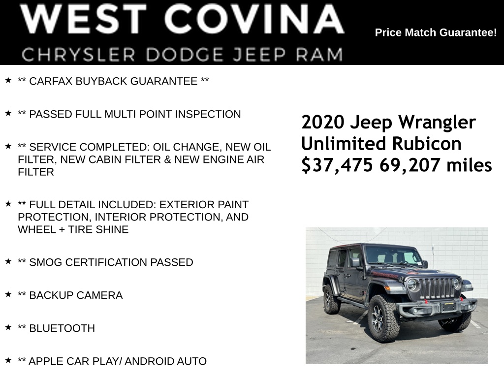 ** GPS NAVIGATION **** BLACK 3-PIECE HARD TOP **** LED LIGHTING GROUP **WE SPECIALIZE IN ALL CREDIT PROFILES! See what we can do for you! Call to find out (626) 899-9302.Recent Arrival! CARFAX One-Owner.22/29 City/Highway MPG ** PASSED FULL MULTI POINT INSPECTION, ** SERVICE COMPLETED: OIL CHANGE, NEW OIL FILTER, NEW CABIN FILTER & NEW ENGINE AIR FILTER, ** FULL DETAIL INCLUDED: EXTERIOR PAINT PROTECTION, INTERIOR PROTECTION, AND WHEEL + TIRE SHINE, ** SMOG CERTIFICATION PASSED, ** BACKUP CAMERA, ** BLUETOOTH, ** APPLE CAR PLAY/ ANDROID AUTO.Gray2020 Jeep Wrangler Unlimited Rubicon 4WD 8-Speed Automatic 3.0L V6 Turbodiesel**********All Pricing and Advertised Prices for any/all vehicles offered for sale does not include dealer installed accessories which can be purchased for an additional cost.********** The Factory Rebates may not be available on this vehicle if you elect to take advantage of a Special Alternative APR or Special Lease program. Some Factory Rebates are California Resident specific and may vary for residents of other states. NO sales to Dealers, Brokers or Exporters. For out of state purchase, customers must be present to purchase. If shipping is required, dealership must facilitate; no exceptions. Please contact us for special Multi-Vehicle or Fleet pricing. Prices are plus government fees and taxes, any finance charges, $85 documentary fee, $29 electronic registration fee, any emission testing charge and $1.75 per new tire state tire fee. *** We make every effort to provide accurate information, but please verify before purchasing. Leasing & financing available on approved credit. Trade-ins accepted. Subject to prior sale.
