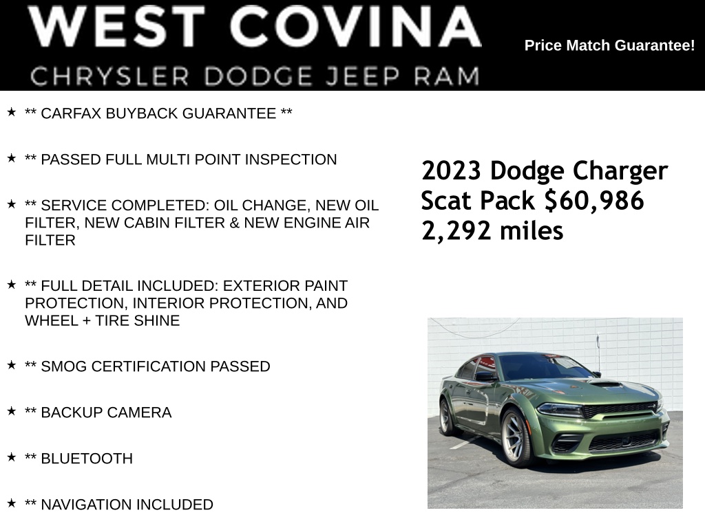 ** NAVIGATION & TRAVEL GROUP **** TECHNOLOGY group **** PLUS GROUP **** SWINGER SPECIAL EDITION **** WIDEBODY COMPETITION SUSPENSION **WE SPECIALIZE IN ALL CREDIT PROFILES! See what we can do for you! Call to find out (626) 899-9302.Recent Arrival! CARFAX One-Owner. Clean CARFAX.** PASSED FULL MULTI POINT INSPECTION, ** SERVICE COMPLETED: OIL CHANGE, NEW OIL FILTER, NEW CABIN FILTER & NEW ENGINE AIR FILTER, ** FULL DETAIL INCLUDED: EXTERIOR PAINT PROTECTION, INTERIOR PROTECTION, AND WHEEL + TIRE SHINE, ** SMOG CERTIFICATION PASSED, ** BACKUP CAMERA, ** BLUETOOTH, ** APPLE CAR PLAY/ ANDROID AUTO.Green2023 Dodge Charger R/T Scat Pack Widebody RWD 8-Speed Automatic SRT HEMI 6.4L V8 MDS**********All Pricing and Advertised Prices for any/all vehicles offered for sale does not include dealer installed accessories which can be purchased for an additional cost.********** The Factory Rebates may not be available on this vehicle if you elect to take advantage of a Special Alternative APR or Special Lease program. Some Factory Rebates are California Resident specific and may vary for residents of other states. NO sales to Dealers, Brokers or Exporters. For out of state purchase, customers must be present to purchase. If shipping is required, dealership must facilitate; no exceptions. Please contact us for special Multi-Vehicle or Fleet pricing. Prices are plus government fees and taxes, any finance charges, $85 documentary fee, $29 electronic registration fee, any emission testing charge and $1.75 per new tire state tire fee. *** We make every effort to provide accurate information, but please verify before purchasing. Leasing & financing available on approved credit. Trade-ins accepted. Subject to prior sale.