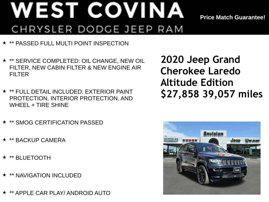 WE SPECIALIZE IN ALL CREDIT PROFILES! See what we can do for you! Call to find out (626) 899-9302.CARFAX One-Owner. Clean CARFAX.Odometer is 22647 miles below market average! ** PASSED FULL MULTI POINT INSPECTION, ** SERVICE COMPLETED: OIL CHANGE, NEW OIL FILTER, NEW CABIN FILTER & NEW ENGINE AIR FILTER, ** FULL DETAIL INCLUDED: EXTERIOR PAINT PROTECTION, INTERIOR PROTECTION, AND WHEEL + TIRE SHINE, ** SMOG CERTIFICATION PASSED, ** BACKUP CAMERA, ** BLUETOOTH, ** NAVIGATION INCLUDED, ** APPLE CAR PLAY/ ANDROID AUTO, 4WD, 1-Year SiriusXM Guardian Trial, 115V Auxiliary Power Outlet, 180 Amp Alternator, 4G LTE Wi-Fi Hot Spot, 5-Year SiriusXM Traffic Service, 5-Year SiriusXM Travel Link Service, 7 & 4 Pin Wiring Harness, 8.4" Touchscreen Display, Advanced Brake Assist, Apple CarPlay, Auto High Beam Headlamp Control, Auto-Dimming Rear-View Mirror, Bi-Xenon High-Intensity Discharge Headlamps, Body Color Shark Fin Antenna, Class IV Receiver Hitch, Dark Lens Taillamps, Disassociated Touchscreen Display, For Details Visit DriveUconnect.com, Front LED Fog Lamps, Full Speed FWD Collision Warn Plus, Gloss Black Rear Fascia Applique, Google Android Auto, GPS Antenna Input, GPS Navigation, HD Radio, Heavy-Duty Engine Cooling, Instrument Cluster w/Off-Road Disp. Pages, Integrated Center Stack Radio, Integrated Voice Command w/Bluetooth, Jeep Black Gloss Badging, Lane Departure Warning Plus, LED Daytime Running Headlamps, Power 4-Way Driver Lumbar Adjust, Power 8-Way Driver/Manual Passenger Seat, Premium Lighting Group, Protech II, Quick Order Package 2BZ Altitude, Radio: Uconnect 4C Nav w/8.4" Display, Rear Fascia Black MIC Step Pad, Rear Load Leveling Suspension, Security & Convenience Group, Security Alarm, SiriusXM Satellite Radio, SiriusXM Traffic Plus, SiriusXM Travel Link, Steering Wheel Mounted Audio Controls, Trailer Tow Group IV, Universal Garage Door Opener, USB Host Flip, Wheels: 20" x 8.0" Gloss Black Aluminum.Diamond Black Crystal Pearlcoat2020 Jeep Grand Cherokee Altitude 4WD 8-Speed Automatic 3.6L V6 24V VVT**********All Pricing and Advertised Prices for any/all vehicles offered for sale does not include dealer installed accessories which can be purchased for an additional cost.********** The Factory Rebates may not be available on this vehicle if you elect to take advantage of a Special Alternative APR or Special Lease program. Some Factory Rebates are California Resident specific and may vary for residents of other states. NO sales to Dealers, Brokers or Exporters. For out of state purchase, customers must be present to purchase. If shipping is required, dealership must facilitate; no exceptions. Please contact us for special Multi-Vehicle or Fleet pricing. Prices are plus government fees and taxes, any finance charges, $85 documentary fee, $29 electronic registration fee, any emission testing charge and $1.75 per new tire state tire fee. *** We make every effort to provide accurate information, but please verify before purchasing. Leasing & financing available on approved credit. Trade-ins accepted. Subject to prior sale.