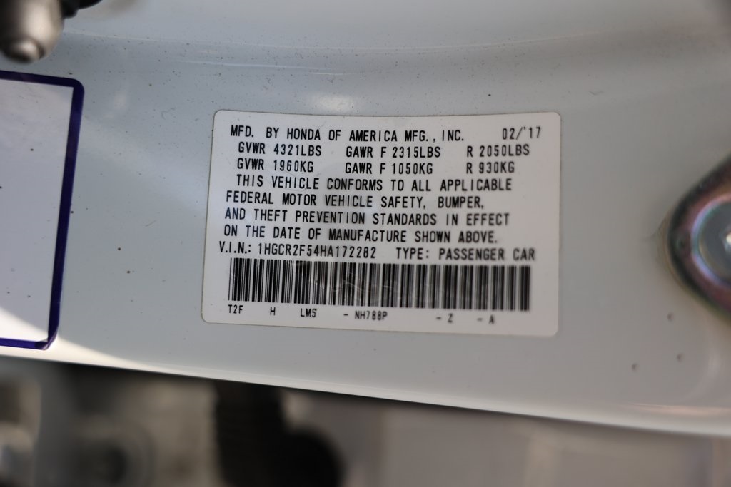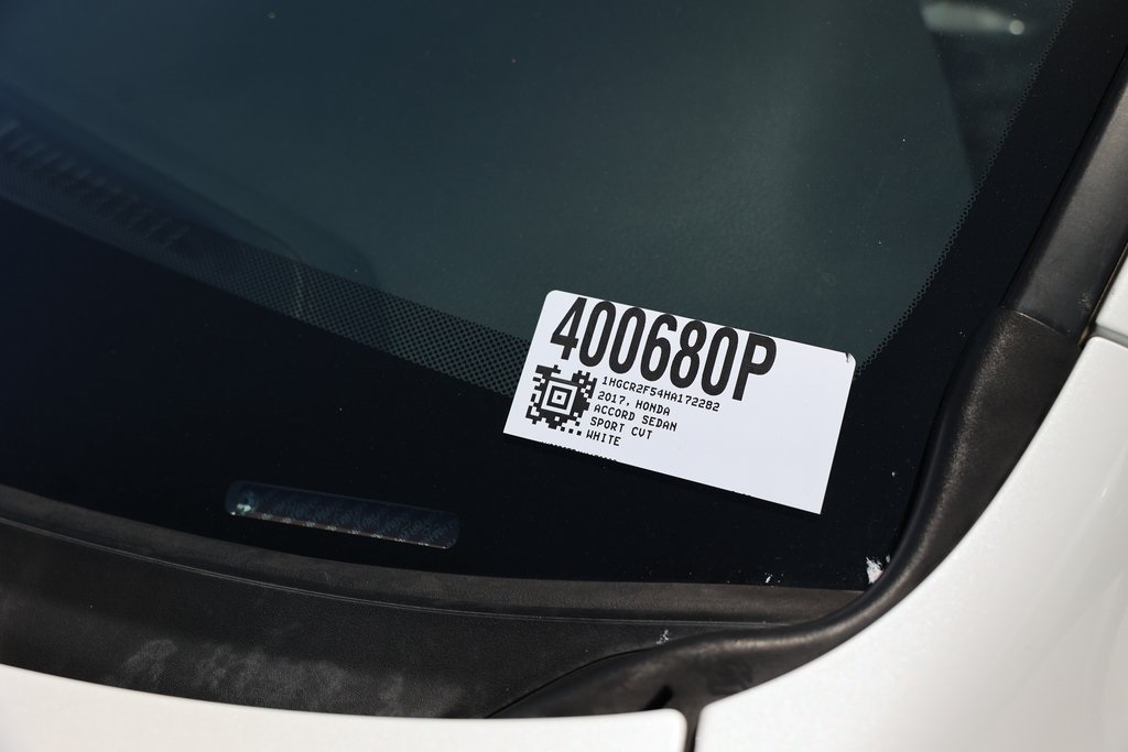 White Orchid Pearl 2017 Honda Accord Sport FWD CVT 2.4L I4 DOHC i-VTEC 16V Black w/Cloth Seat Trim, 19" Alloy Wheels, 4 Speakers, Air Conditioning, Exterior Parking Camera Rear, Fully automatic headlights, Radio: 160-Watt AM/FM Audio System.Recent Arrival! Odometer is 36502 miles below market average! 26/34 City/Highway MPGAwards: * 2017 IIHS Top Safety Pick+ (When equipped with Honda Sensing and specific headlights) * 2017 KBB.com 10 Most Awarded Brands * 2017 KBB.com Brand Image AwardsKelley Blue Book Brand Image Awards are based on the Brand Watch(tm) study from Kelley Blue Book Market Intelligence. Award calculated among non-luxury shoppers. For more information, visit www.kbb.com. Kelley Blue Book is a registered trademark of Kelley Blue Book Co., Inc.