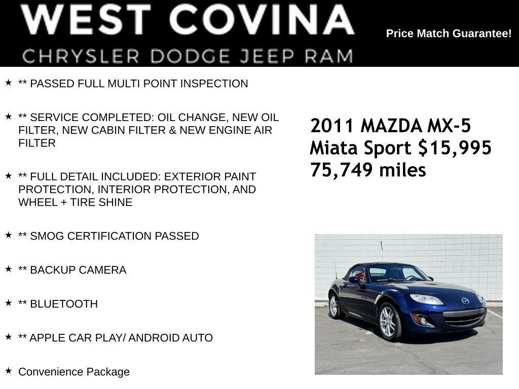 ** SPORT-TUNED SINGLE EXHAUST W/DUAL SILVER OUTLETS **** 5-SPEED MANUAL TRANSMISSION **** 2.0 DOHC 16V **WE SPECIALIZE IN ALL CREDIT PROFILES! See what we can do for you! Call to find out (626) 899-9302.Recent Arrival! Clean CARFAX.22/28 City/Highway MPG ** PASSED FULL MULTI POINT INSPECTION, ** SERVICE COMPLETED: OIL CHANGE, NEW OIL FILTER, NEW CABIN FILTER & NEW ENGINE AIR FILTER, ** FULL DETAIL INCLUDED: EXTERIOR PAINT PROTECTION, INTERIOR PROTECTION, AND WHEEL + TIRE SHINE, ** SMOG CERTIFICATION PASSED, ** BACKUP CAMERA, ** BLUETOOTH, ** APPLE CAR PLAY/ ANDROID AUTO, Black Cloth.Stormy Blue Mica2011 Mazda Miata Sport RWD 5-Speed Manual 2.0L I4 DOHC VVT 16V**********All Pricing and Advertised Prices for any/all vehicles offered for sale does not include dealer installed accessories which can be purchased for an additional cost.********** The Factory Rebates may not be available on this vehicle if you elect to take advantage of a Special Alternative APR or Special Lease program. Some Factory Rebates are California Resident specific and may vary for residents of other states. NO sales to Dealers, Brokers or Exporters. For out of state purchase, customers must be present to purchase. If shipping is required, dealership must facilitate; no exceptions. Please contact us for special Multi-Vehicle or Fleet pricing. Prices are plus government fees and taxes, any finance charges, $85 documentary fee, $29 electronic registration fee, any emission testing charge and $1.75 per new tire state tire fee. *** We make every effort to provide accurate information, but please verify before purchasing. Leasing & financing available on approved credit. Trade-ins accepted. Subject to prior sale.Reviews: * If you enjoy an immediate connection between steering wheel and roadway, you'll revel in the performance of the MX-5 Miata. There is absolutely nothing extraneous to the architecture, and while its footprint may be an expansion on the '60s-era Lotus that inspired it, there are few cars today – and virtually none in the U.S. market – that better combine fun, efficiency and affordability. And its hardtop (now about 2/3 of sales) makes the Miata amenable to most climes. Source: KBB.com