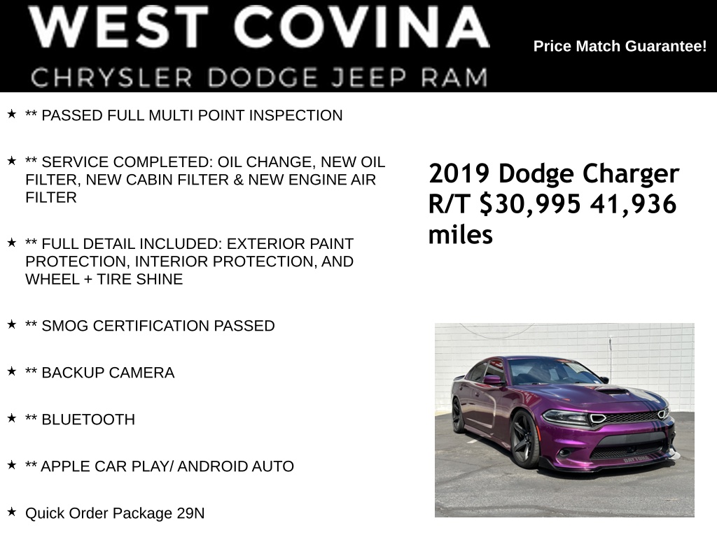 ** DAYTONA EDITION GROUP **** TECHNOLOGY GROUP **** DRIVER CONFIDENCE GROUP **** HARMON KARDON AUDIO GROUP **WE SPECIALIZE IN ALL CREDIT PROFILES! See what we can do for you! Call to find out (626) 899-9302.Recent Arrival!** PASSED FULL MULTI POINT INSPECTION, ** SERVICE COMPLETED: OIL CHANGE, NEW OIL FILTER, NEW CABIN FILTER & NEW ENGINE AIR FILTER, ** FULL DETAIL INCLUDED: EXTERIOR PAINT PROTECTION, INTERIOR PROTECTION, AND WHEEL + TIRE SHINE, ** SMOG CERTIFICATION PASSED, ** BACKUP CAMERA, ** BLUETOOTH, ** APPLE CAR PLAY/ ANDROID AUTO, Black Artificial Leather.Destroyer Gray Clearcoat2019 Dodge Charger R/T RWD 8-Speed Automatic HEMI 5.7L V8 Multi Displacement VVT**********All Pricing and Advertised Prices for any/all vehicles offered for sale does not include dealer installed accessories which can be purchased for an additional cost.********** The Factory Rebates may not be available on this vehicle if you elect to take advantage of a Special Alternative APR or Special Lease program. Some Factory Rebates are California Resident specific and may vary for residents of other states. NO sales to Dealers, Brokers or Exporters. For out of state purchase, customers must be present to purchase. If shipping is required, dealership must facilitate; no exceptions. Please contact us for special Multi-Vehicle or Fleet pricing. Prices are plus government fees and taxes, any finance charges, $85 documentary fee, $29 electronic registration fee, any emission testing charge and $1.75 per new tire state tire fee. *** We make every effort to provide accurate information, but please verify before purchasing. Leasing & financing available on approved credit. Trade-ins accepted. Subject to prior sale.Awards: * 2019 KBB.com Best Resale Value Awards * 2019 KBB.com Brand Image Awards