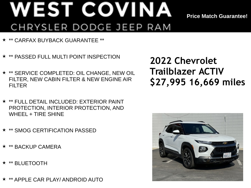 ** LIFTGATE, POWER, HANDS FREE **** PANORAMIC SUNROOF **** TECHNOLOGY PACKAGE **** CONVENIENCE PACKAGE **WE SPECIALIZE IN ALL CREDIT PROFILES! See what we can do for you! Call to find out (626) 899-9302.Recent Arrival! CARFAX One-Owner. Clean CARFAX.29/33 City/Highway MPG ** PASSED FULL MULTI POINT INSPECTION, ** SERVICE COMPLETED: OIL CHANGE, NEW OIL FILTER, NEW CABIN FILTER & NEW ENGINE AIR FILTER, ** FULL DETAIL INCLUDED: EXTERIOR PAINT PROTECTION, INTERIOR PROTECTION, AND WHEEL + TIRE SHINE, ** SMOG CERTIFICATION PASSED, ** BACKUP CAMERA, ** BLUETOOTH, ** APPLE CAR PLAY/ ANDROID AUTO.White2022 Chevrolet TrailBlazer ACTIV FWD CVT 1.3L Ecotec Turbo DOHC SIDI w/VVT**********All Pricing and Advertised Prices for any/all vehicles offered for sale does not include dealer installed accessories which can be purchased for an additional cost.********** The Factory Rebates may not be available on this vehicle if you elect to take advantage of a Special Alternative APR or Special Lease program. Some Factory Rebates are California Resident specific and may vary for residents of other states. NO sales to Dealers, Brokers or Exporters. For out of state purchase, customers must be present to purchase. If shipping is required, dealership must facilitate; no exceptions. Please contact us for special Multi-Vehicle or Fleet pricing. Prices are plus government fees and taxes, any finance charges, $85 documentary fee, $29 electronic registration fee, any emission testing charge and $1.75 per new tire state tire fee. *** We make every effort to provide accurate information, but please verify before purchasing. Leasing & financing available on approved credit. Trade-ins accepted. Subject to prior sale.Awards: * 2022 IIHS Top Safety Pick+